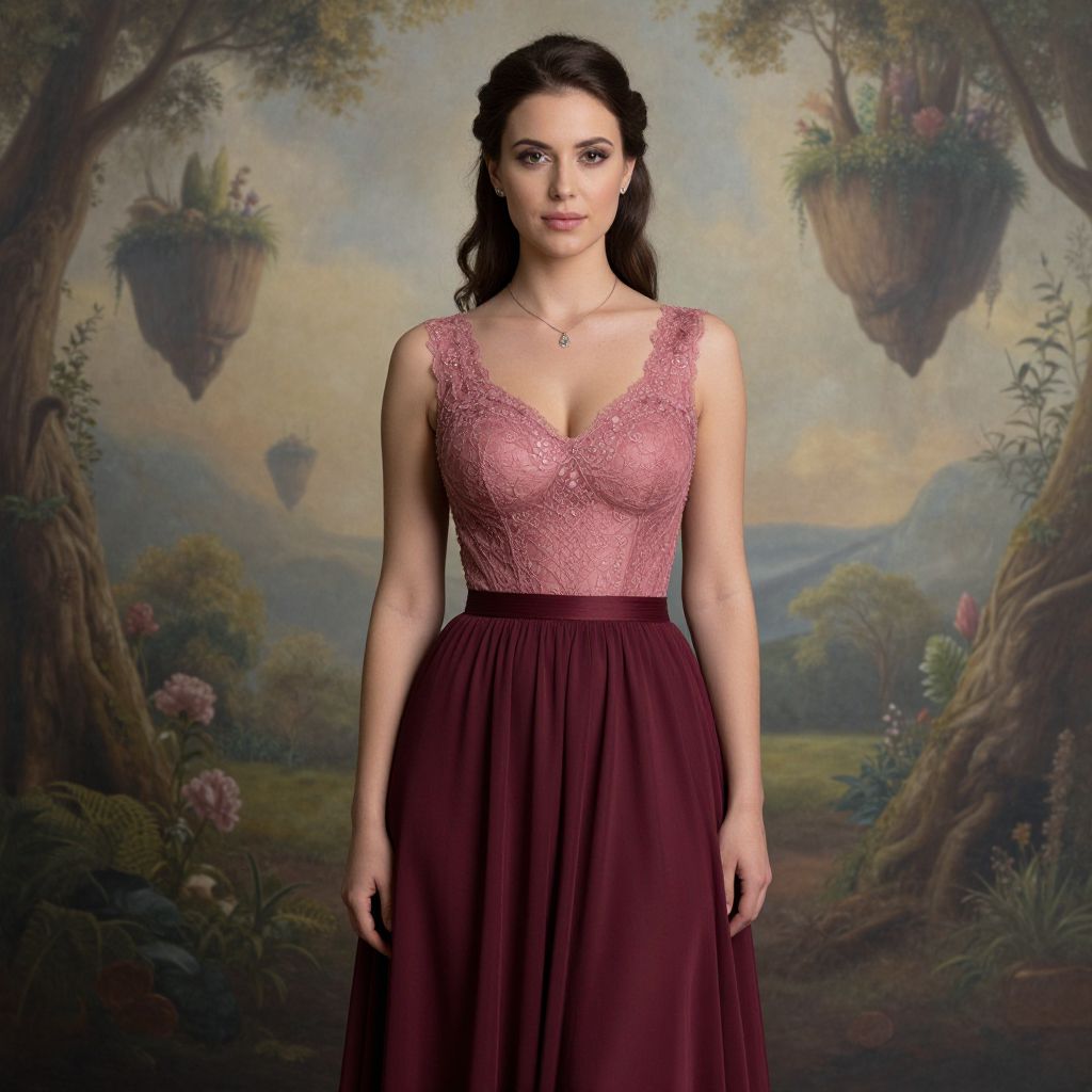 Photograph of a young woman with fair skin and dark brown wavy hair, styled in an elegant updo. She wears a sleeveless, deep V-neck lace top in a dusty pink shade, highlighting her moderate-sized breasts, and a high-waisted, dark burgundy floor-length skirt. She stands against a fantasy-themed backdrop featuring floating gardens, misty mountains, and whimsical hanging baskets. The background is painted in soft, muted colors of green, blue, and yellow, creating a magical forest ambiance. She wears a delicate necklace with a small pendant and has a confident, serene expression on her face.