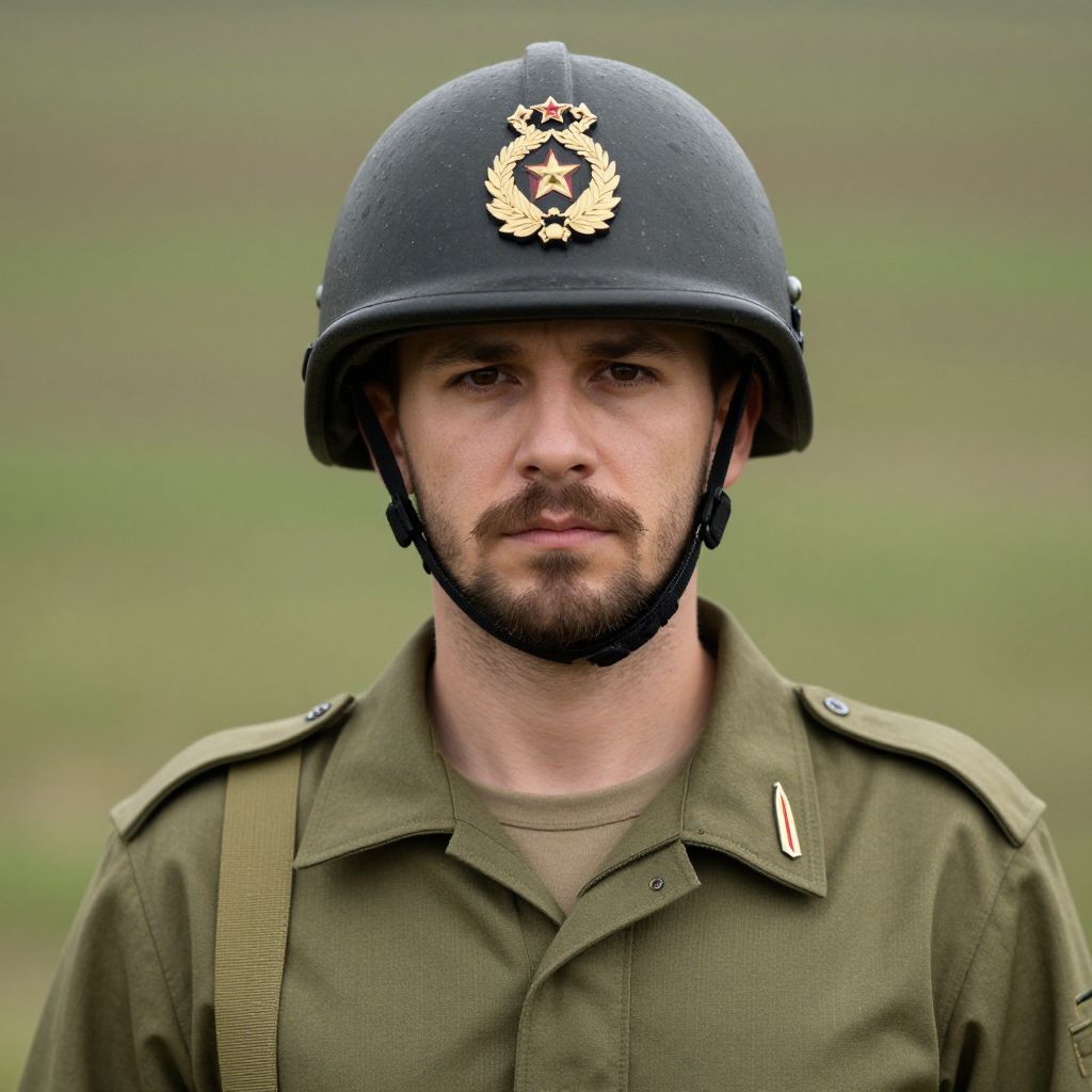 Photograph of a serious, bearded male soldier with light skin, wearing a black helmet with a gold emblem, olive green uniform, and suspenders