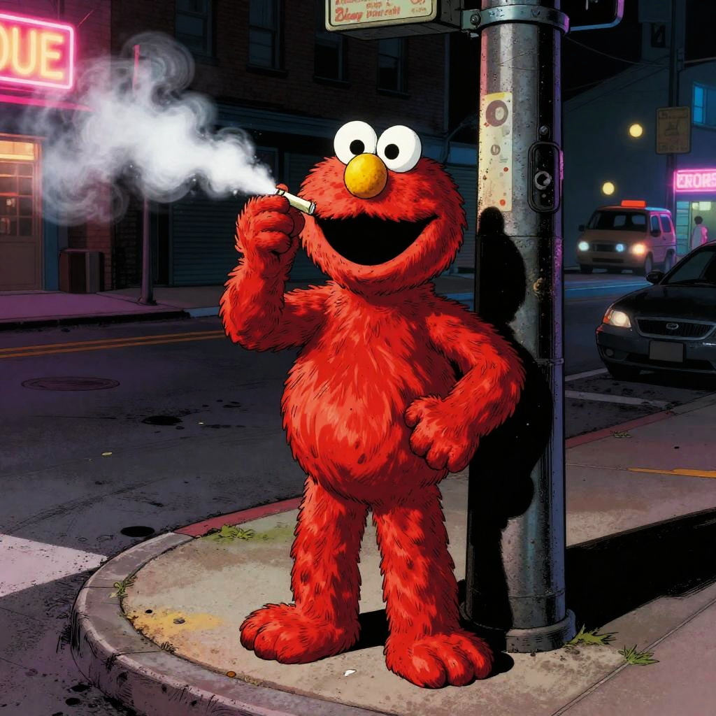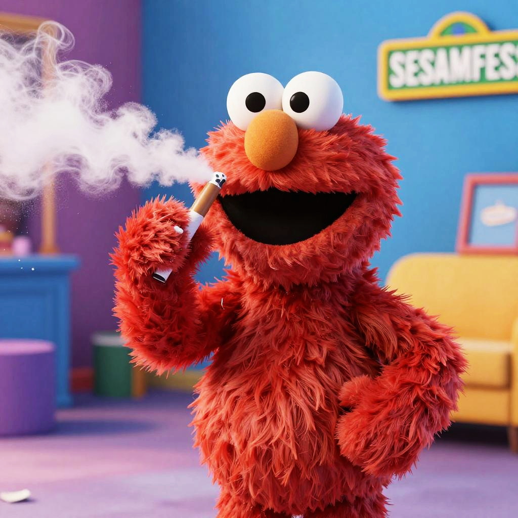 Elmo sniffing coke powder on a colorful Sesame Street background, detailed vibrant texture, cartoon style, playful yet chaotic scene with bright lighting