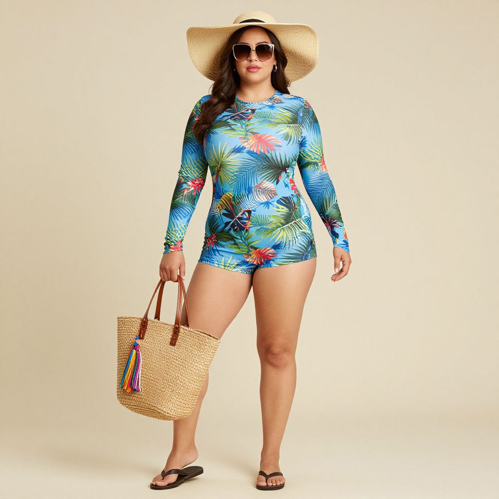Full body shot, stocky woman, long sleeve swimsuit, vibrant tropical print, stretchy quick-dry fabric, high neckline, fitted silhouette, thumbholes at cuffs, matching swim shorts underneath, wide-brimmed straw hat, oversized straw tote bag, natural woven texture, leather straps, colorful tassel accents, flip-flops with arch support, minimal jewelry, oversized sunglasses, beach-ready vibe Sexy. Pretty face and beаutiful eyes. Big breasts