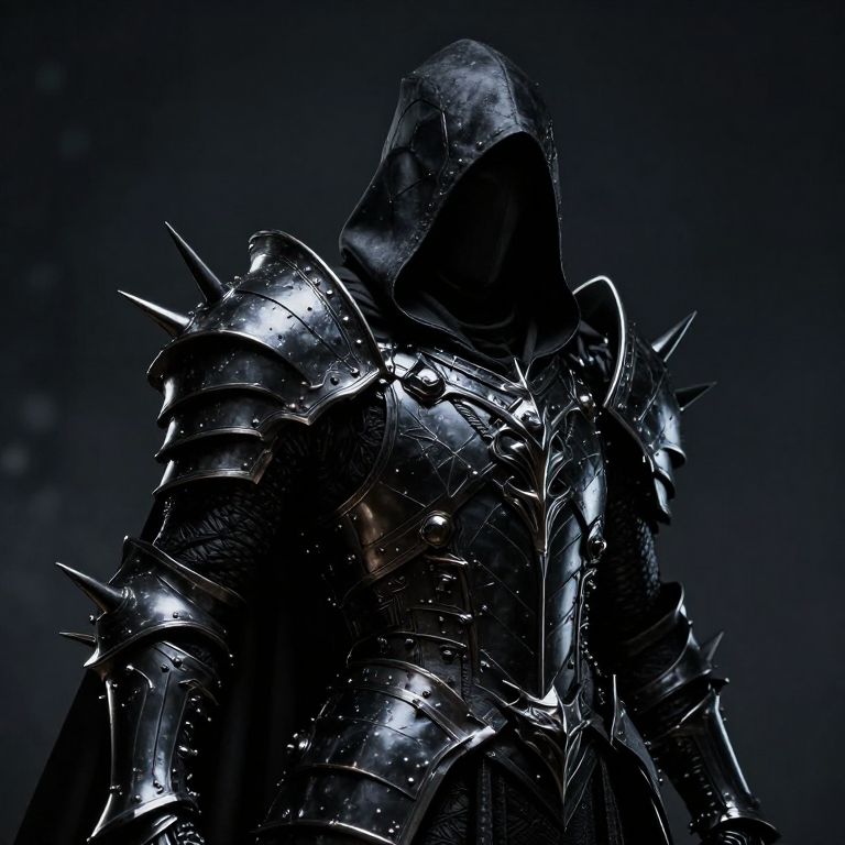 The image depicts a highly detailed and intricate depiction of a hooded figure, likely a Deathknight, adorned in elaborate black metal armor. The armor is adorned with sharp spikes and ornate designs, giving it a menacing and imposing appearance. The figure is set against a dark, gloomy background, which enhances the ominous atmosphere. The lighting is dramatic, with a strong contrast between light and shadow, creating a sense of depth and texture. The overall composition is dynamic, with the figure positioned centrally, drawing the viewer's eye immediately to the intricate details of the armor. The use of black metal and the dark, shadowy background create a sense of mystery and foreboding, while the sharp spikes and ornate designs add a sense of complexity and richness to the image. The figure's hooded appearance adds an element of intrigue, as the face remains hidden, adding to the enigmatic quality of the scene. The overall effect is a powerful and visually striking representation of a dark, mystical figure, captured in a highly detailed and expressive manner.