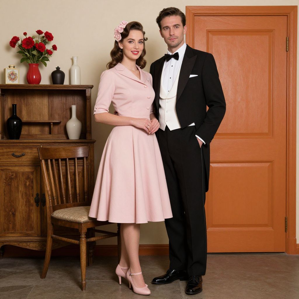 Elegantly dressed couple posing together in a retro-inspired setting, featuring a woman in a pastel pink 1950s-style dress with floral hair accessory and matching heels, alongside a man in a classic black tuxedo with a white vest and bow tie, set against a backdrop of a wooden cabinet adorned with red flowers and vases, a wooden chair, and a closed orange door.