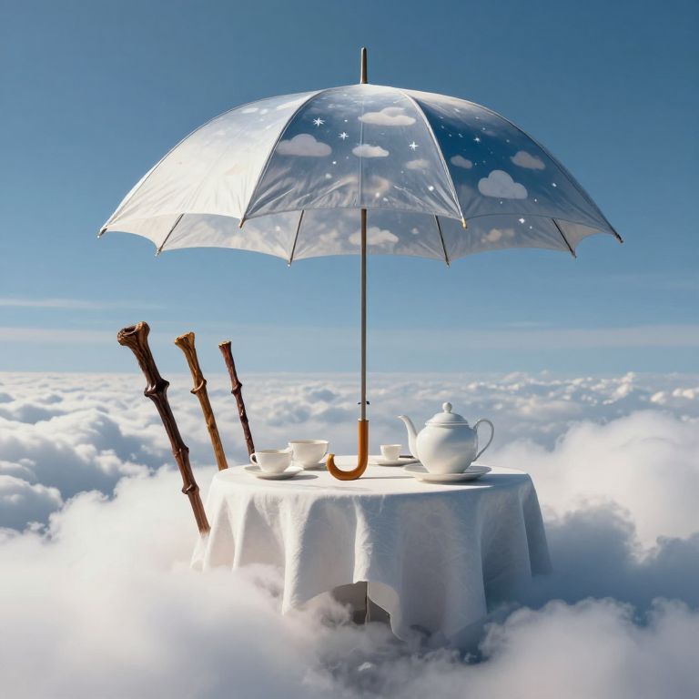 A sentient umbrella with a collection of walking sticks organizes weekly tea parties on cloud tops for forgotten weather patterns.