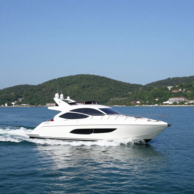 Sunseeker Manhattan 66 cruising gracefully across calm waters, leaving a trail of white foam as it speeds past lush green hills and distant structures under a clear blue sky.