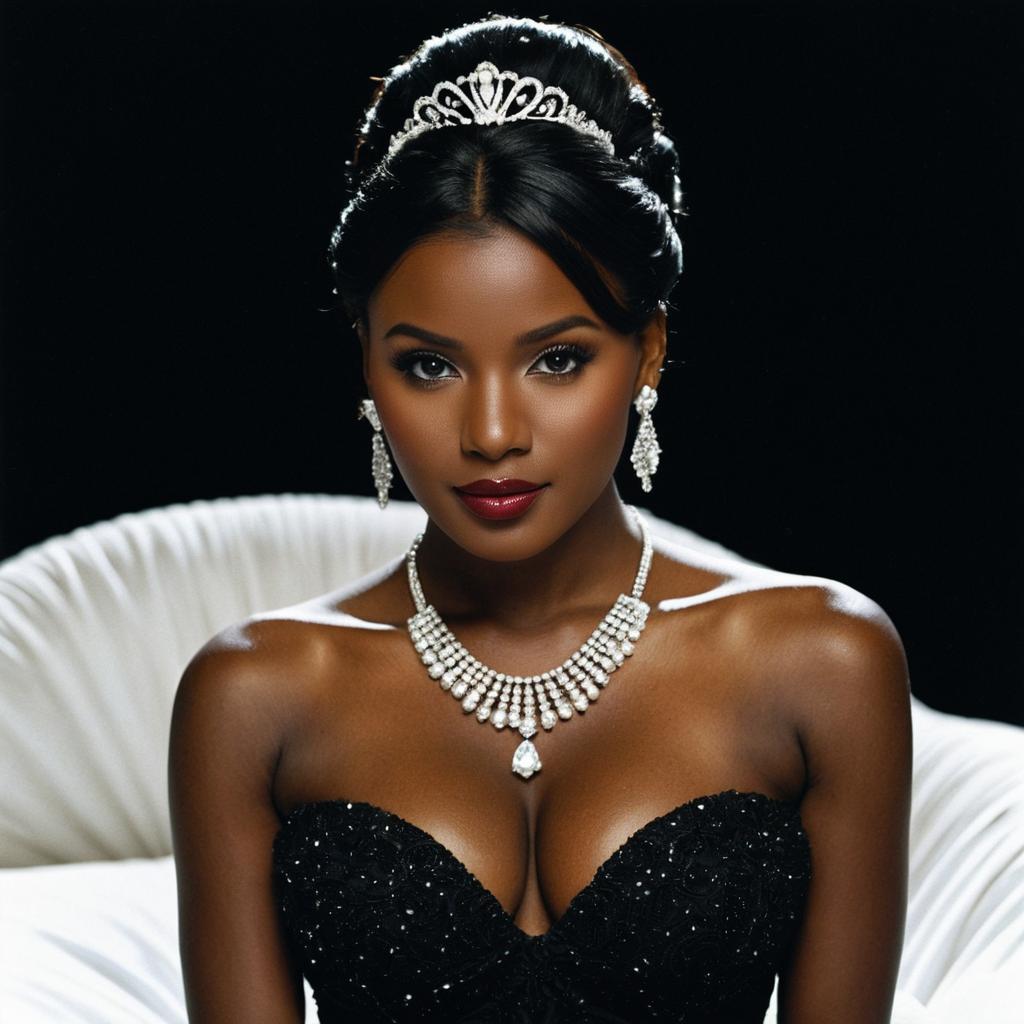Portrait of a dark-skinned black bride with a sophisticated wedding updo hairstyle, wearing a sparkling black strapless dress. She is adorned with a silver tiara, matching chandelier earrings, and a statement necklace. The bride gazes confidently at the viewer with flawless makeup and glossy red lips, showcasing bare shoulders and cleavage against a dark background.