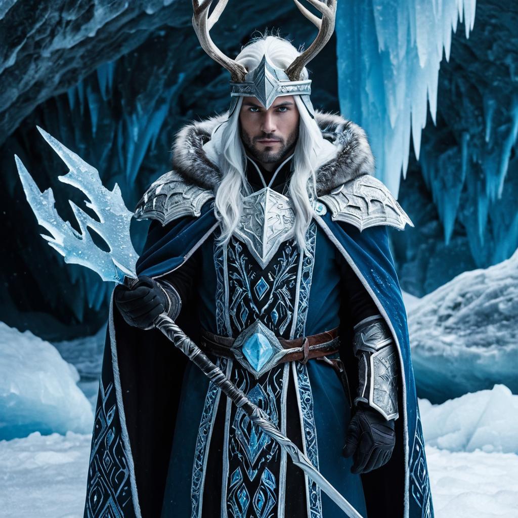 Cinematic photo of Sylas, the Arctic Phantom, (high detail, 8k), standing in a frozen glacier cave, striking icy blue eyes, pale angular face, long icy white hair with silver streaks. Stunning outfit: frost-covered midnight-blue cloak with intricate frost patterns. wearing an antlered helmet frosted with crystals, holding a spear made of ice. ethereal frost wisps swirling around him. cold blue light highlighting the icy textures, evoking a powerful and captivating atmosphere in a frost-covered realm.