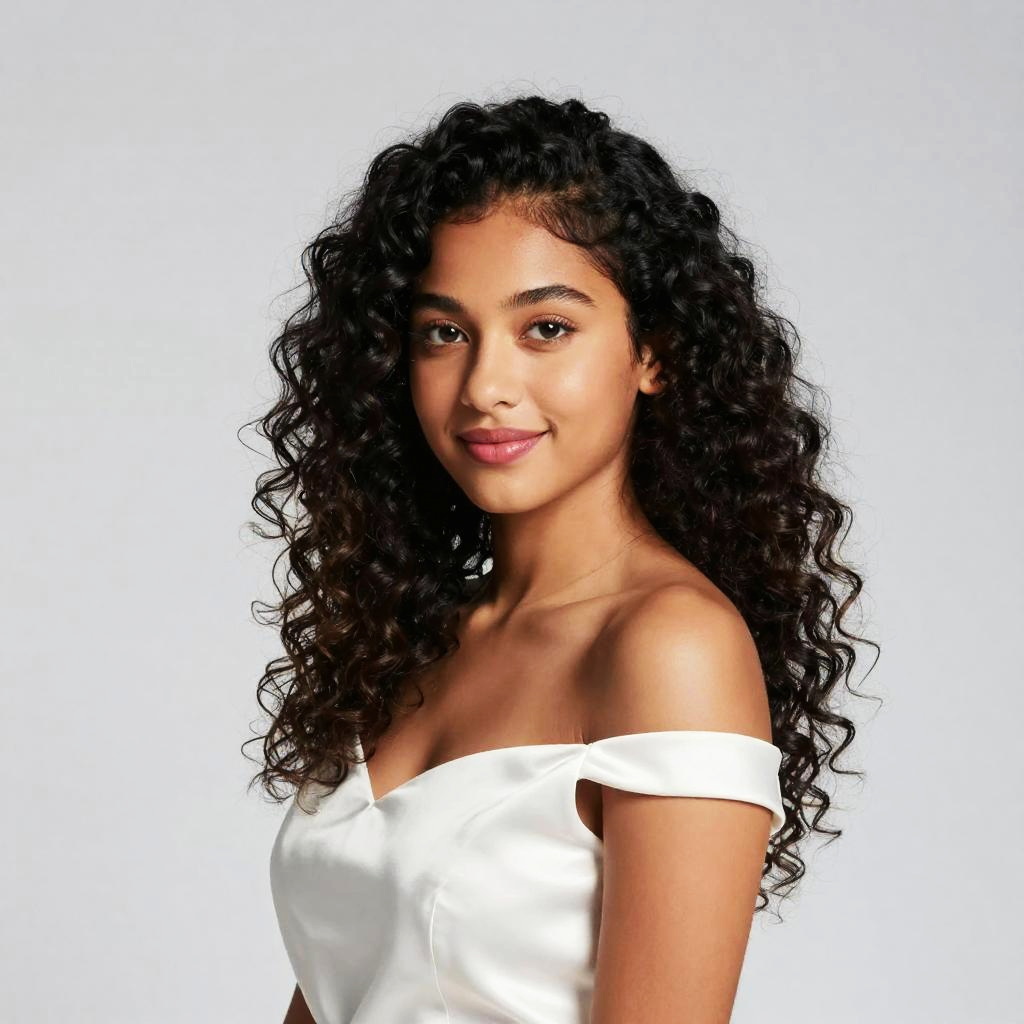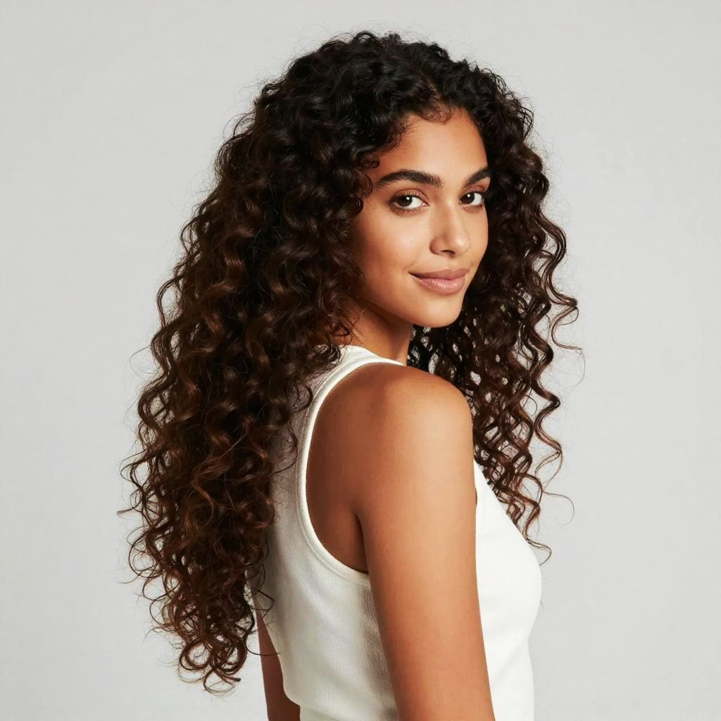 Photograph of a young woman with long, voluminous curly black hair cascading down her back. She has a light brown skin tone and is looking over her shoulder with a subtle smile. She's wearing a white sleeveless top that contrasts with her dark hair. The background is a plain, light gray. Her natural beauty and confident pose make her the focal point of the image.