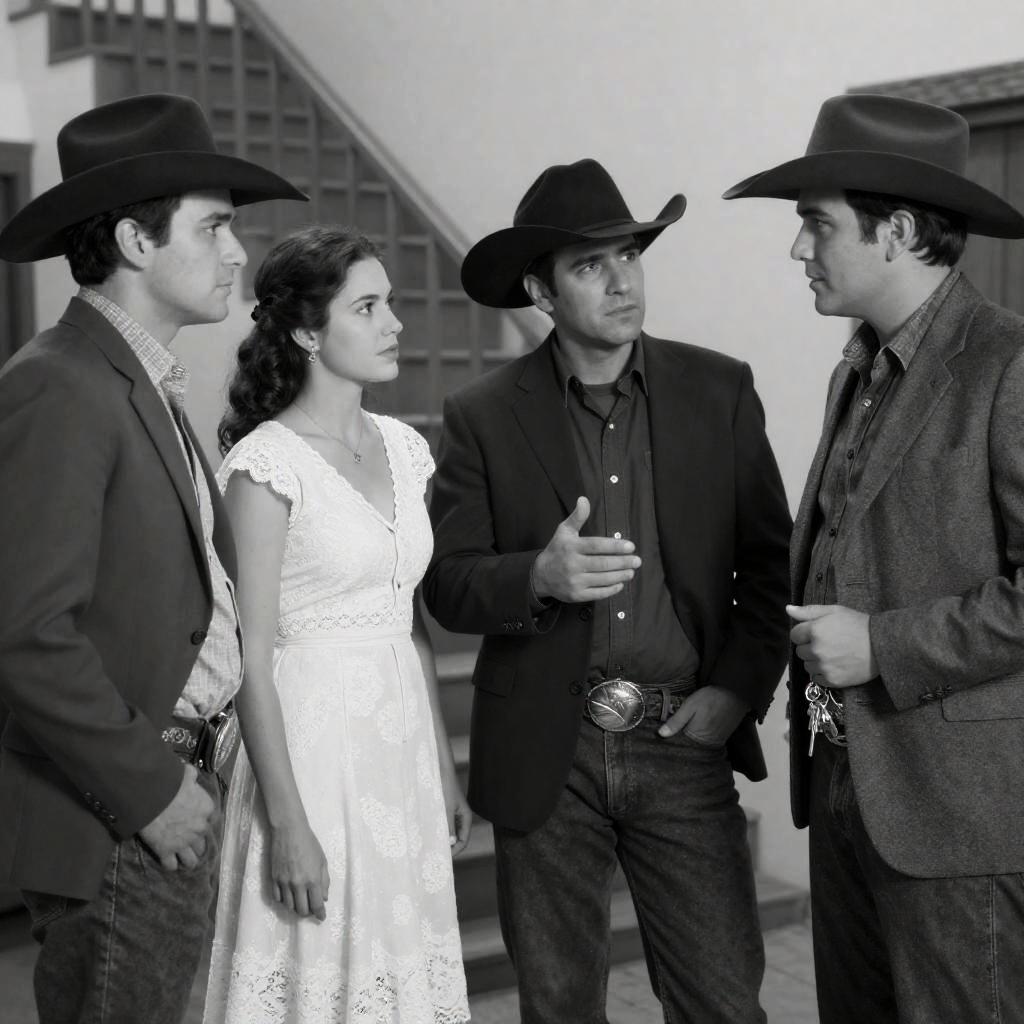 Black and white photograph of four men wearing cowboy hats sitting around a wooden table in a bar. They are drinking whiskey from glass tumblers and socializing. The background features a large whiskey sign and framed photographs on the wall. The men are dressed in casual western attire with button-down shirts and hats.