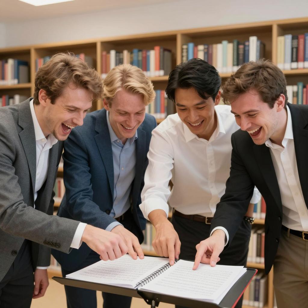 Four men leaning over a music stand, laughing and pointing at sheet music. First man on left, gray suit, yelling. Second man, blonde hair, blue jacket, smiling. Third man, white shirt, smiling. Fourth man, black, white shirt, laughing. Library setting with bookshelves in background. Bright lighting.