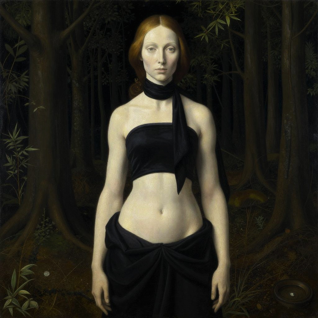 Painting of a woman with silk-textured skin, slim, tall, dressed in black with a cashmere scarf around her neck, set in a nighttime forest scene in the style of Hieronymus Bosch.