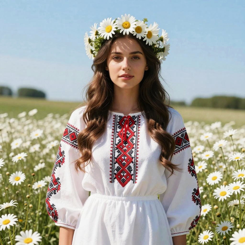 Photograph of a young woman with long, wavy brown hair wearing a white dress adorned with red and black geometric embroidery on the sleeves and chest. She has a daisy chain crown with white daisies and yellow centers. She stands in a sunlit field of blooming white daisies, with a clear blue sky and distant green trees in the background. Her expression is calm, and the bright daylight enhances the vividness of the daisies and her dress. The overall scene evokes a sense of natural beauty and simplicity.