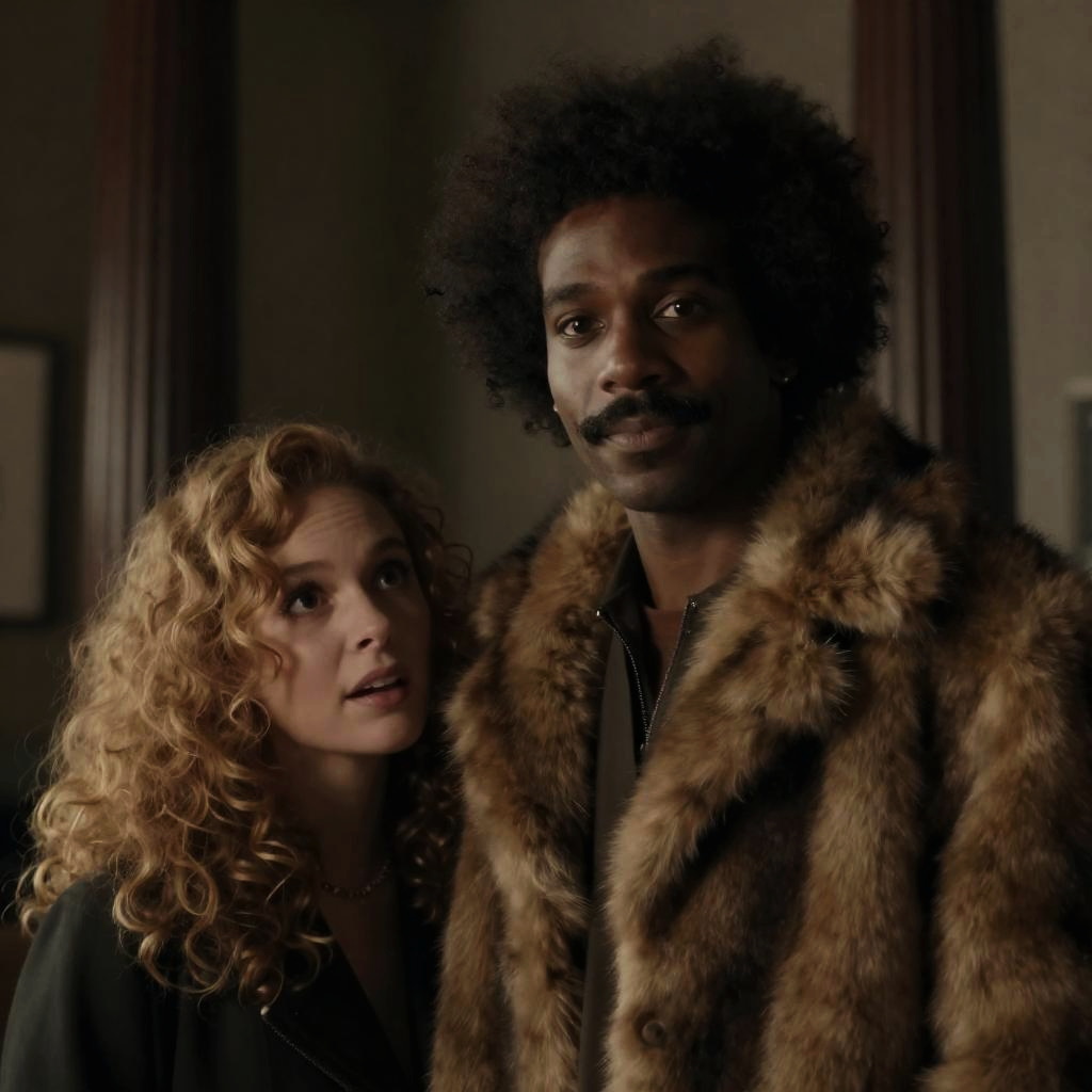 Photograph of a man and woman indoors. Man with dark skin, mustache, and large afro, wearing a fur coat, looks at the camera with a slight smile. Woman with light skin, curly blonde hair, and a surprised expression, looks up at the man. Background includes dark, wooden columns. Man's fur coat is brown and fluffy. Woman is slightly to the left of the man, closer to the camera.