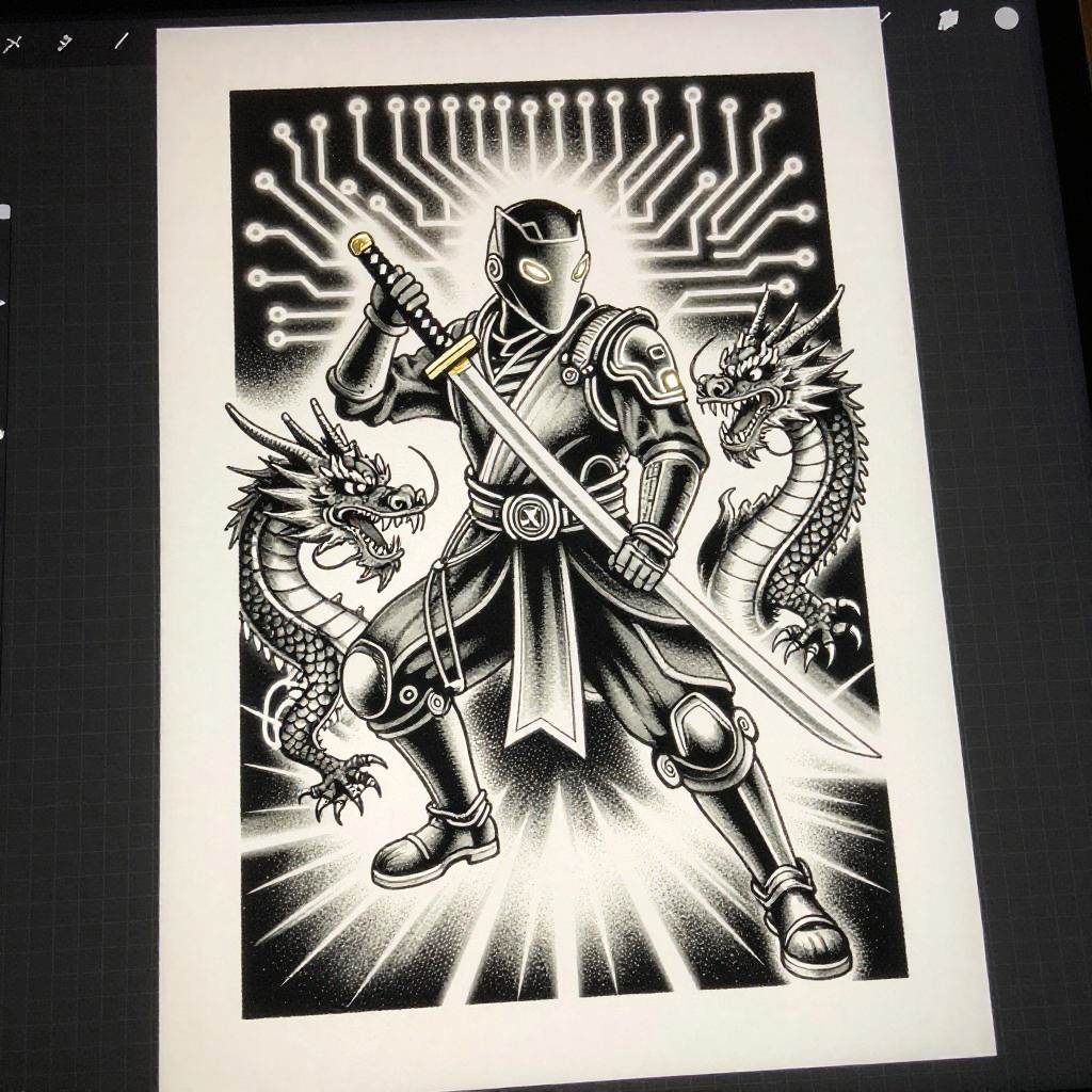 Black and white ink illustration of a futuristic cyber ninja wielding a katana, surrounded by two detailed cyber dragons. The background features glowing circuit board patterns, radiant energy effects, and bold use of negative space, stippling, and crosshatching. The image combines vintage tattoo flash style with a sci-fi theme.