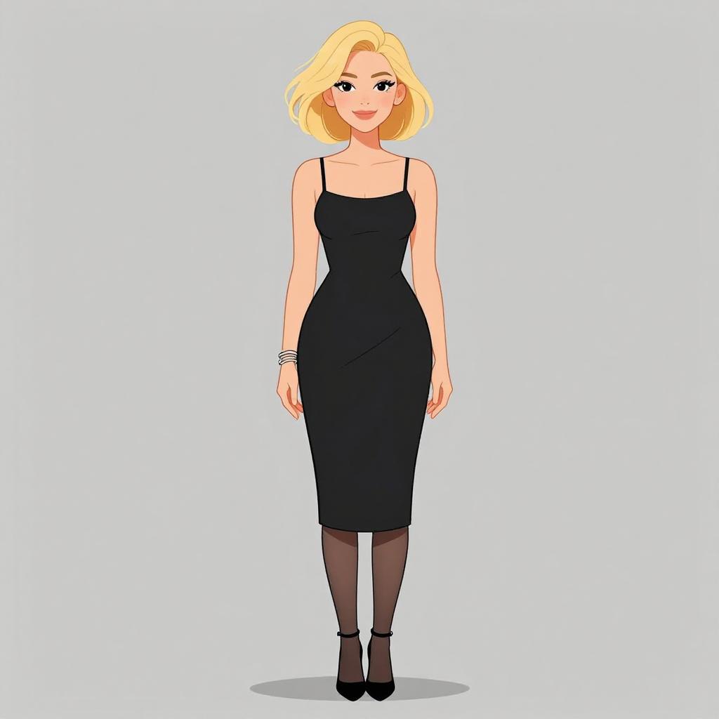 Woman with pretty face and pretty hair. smiling Woman, minimalist chic, sleeveless black lace dress, shift silhouette, round neckline, mini length, invisible seam pockets, plain black flats, straight blonde hair, simple makeup, neutral studio background. --sref 1467