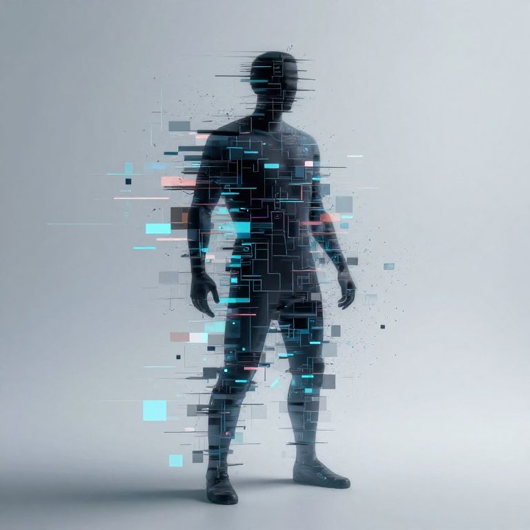 Silhouetted male figure standing against bright white background, partially pixelated with blue and red digital elements. Digital art style.