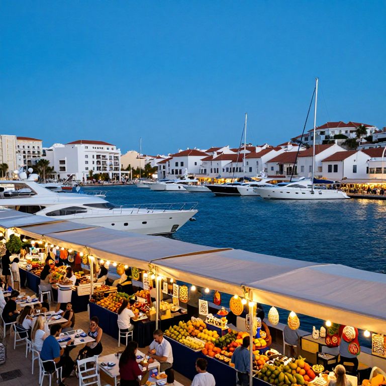 Photograph of a vibrant evening scene at a waterfront marina. In the foreground, an outdoor market with colorful fruit stands and lit lanterns is bustling with people. They sit at tables, some dining, others chatting. The background features a clear blue sky and a calm marina with several white yachts docked. White and red-roofed buildings line the waterfront, adding to the picturesque coastal charm. The water reflects the evening light, and the overall atmosphere is lively and inviting.