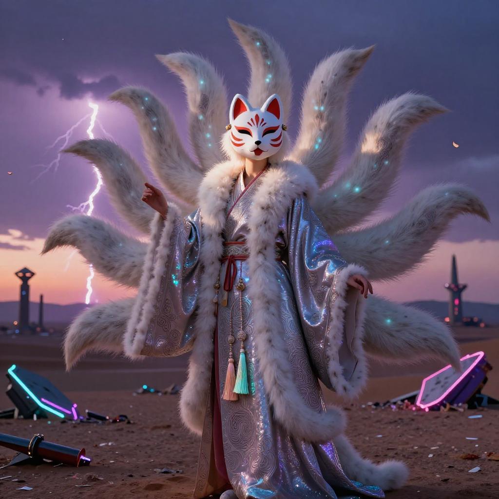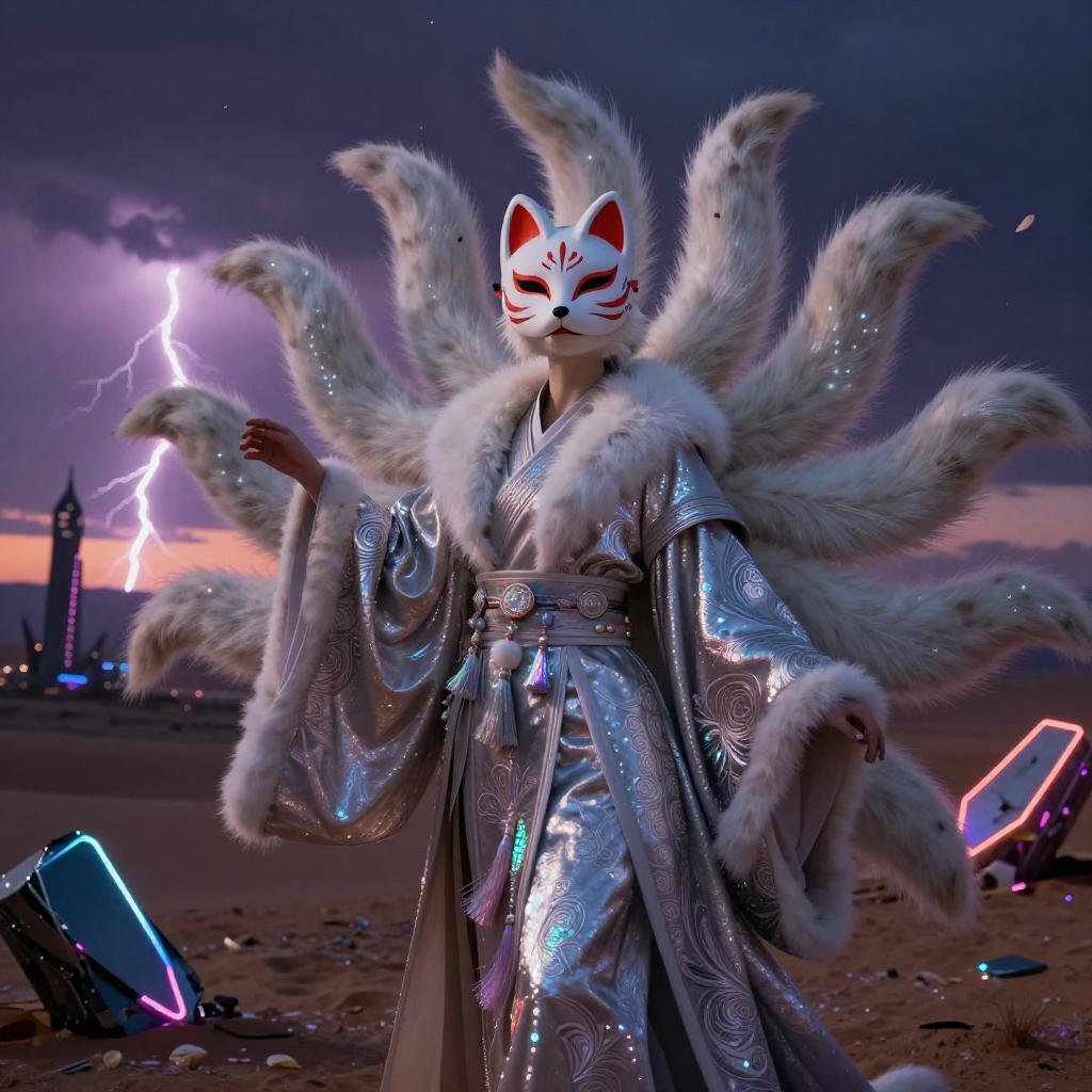 Best quality, masterpiece, ultra high res, raw photo, beautiful and aesthetic, deep shadow, dark theme, (photorealistic:1.4), kitsune spirit wearing a lacquered fox mask, nine ethereal tails and faint bioluminescent markings, wearing ceremonial alloy robe trimmed with white fox fur, holographic tassels and subtle engraved filigree, soft smile, open mouth, closed eyes, ((chiaroscuro, backlight, sunset, petals floating)), graceful poise, evocative atmosphere, magnetic presence, captivating mystique, intricate zentangle patterns, astonishing level of detail, striking perspective, a chaotic masterpiece balanced by harmony, vibrant color palette, ((outdoors)), desert ridge scattered with shattered neon monoliths and distant lightning under a violet dusk, silhouettes of futurist architecture on the horizon, inspired by futurist architecture