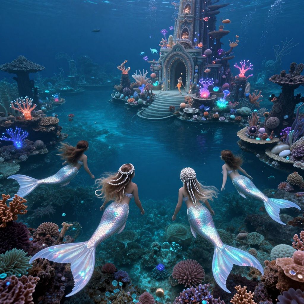 A serene underwater scene inspired by the dreamy landscapes of surrealist painters, showcasing a mystical mermaid oasis where bioluminescent plants and coral create a mesmerizing, otherworldly glow. From an aerial perspective above a tranquil lagoon, intricate details reveal themselves, such as the delicate scales on the mermaids' tails shimmering like opals, and their flowing hair woven with strands of pearls and sea glass. In the distance, a majestic palace made of coral and seashells emerges from the depths, adorned with luminescent creatures that seem to dance gracefully in time with the rhythm of the ocean's heartbeat. This enchanting scene evokes feelings of wonder, tranquility, and an inexplicable connection between the underwater realm and the mysteries of the human spirit.