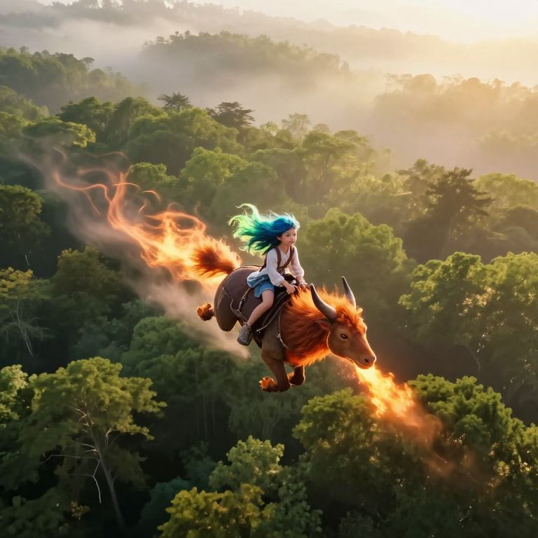 An enchanting scene unfolds as two companions embark on an aerial journey above a verdant forest canopy. A young girl with shimmering hair of vibrant blue and green hues sits serenely atop a magnificent creature, its fiery breath trailing behind them like ribbons in the wind. From a high vantage point, the dynamic duo soars gracefully through the misty landscape bathed in golden sunlight that filters through the dense foliage, casting an ethereal glow upon their path. This magical encounter captures the harmonious bond between nature and mythical beings as they traverse the sky together, symbolizing unity and the awe-inspiring beauty of untamed wilderness.