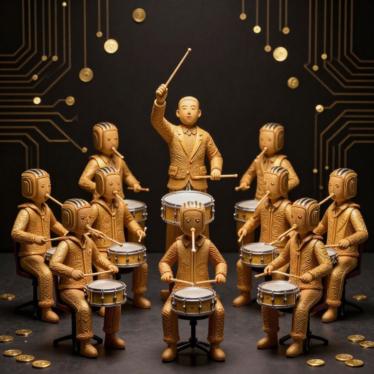 Photograph of golden, intricately detailed figurines playing drums and a conductor's stand, arranged in a circle against a black, circuit-like background with