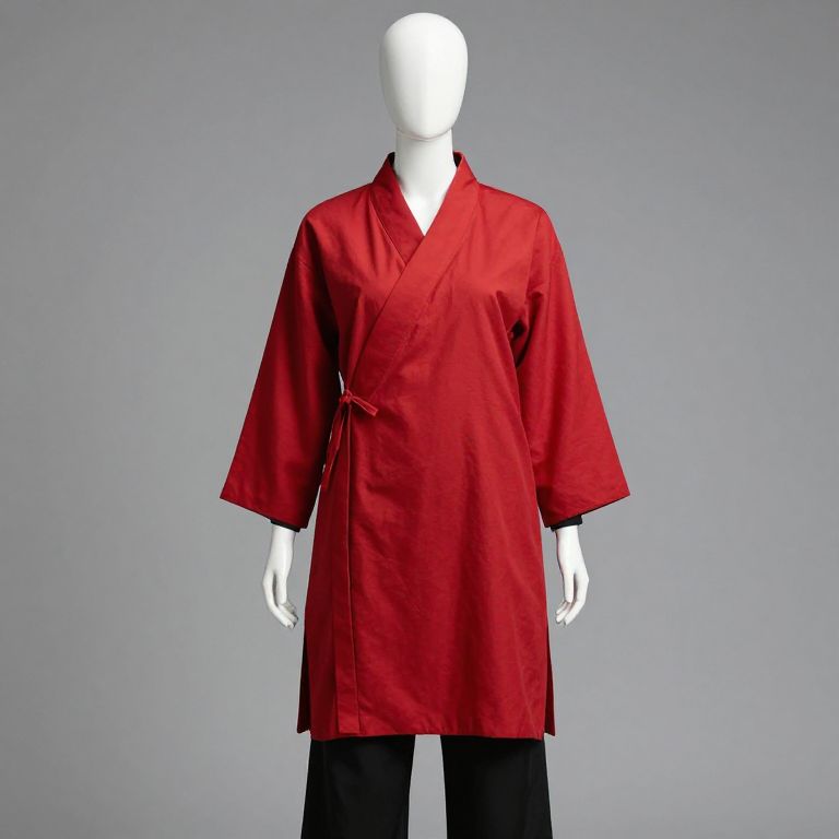 Photograph of a white mannequin displaying a vibrant red kimono-style robe. The robe has a V-neck and is tied at the waist with a simple knot. It features straight, slightly oversized sleeves and a smooth, slightly glossy texture. The mannequin's arms hang naturally at its sides. The background is a solid, gradient gray that transitions from darker at the top to lighter at the bottom, highlighting the red robe. The mannequin is bare-headed and has no visible facial features. The bottom of the mannequin is dressed in black pants, which are plain and unadorned.