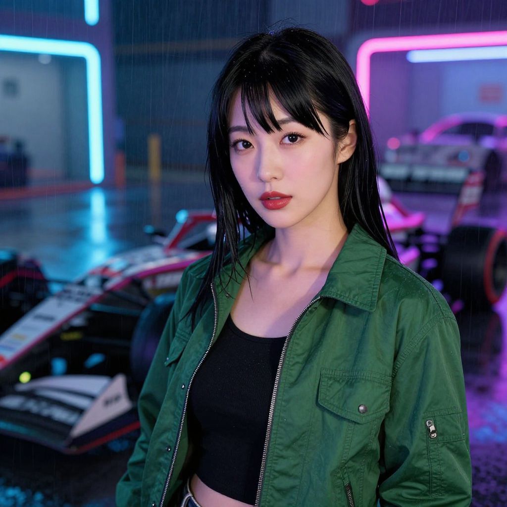 Photograph of an East Asian woman with long, straight black hair and fair skin, standing in a rainy, neon-lit urban setting. She wears a green military-style jacket over a black crop top, showcasing a slim figure. Her red lips and intense gaze add a striking contrast. The background features blurred, colorful neon lights in blue and pink, with a red car partially visible on the right. The wet ground reflects the neon hues, adding a cyberpunk aesthetic. The woman's expression is serious and focused.