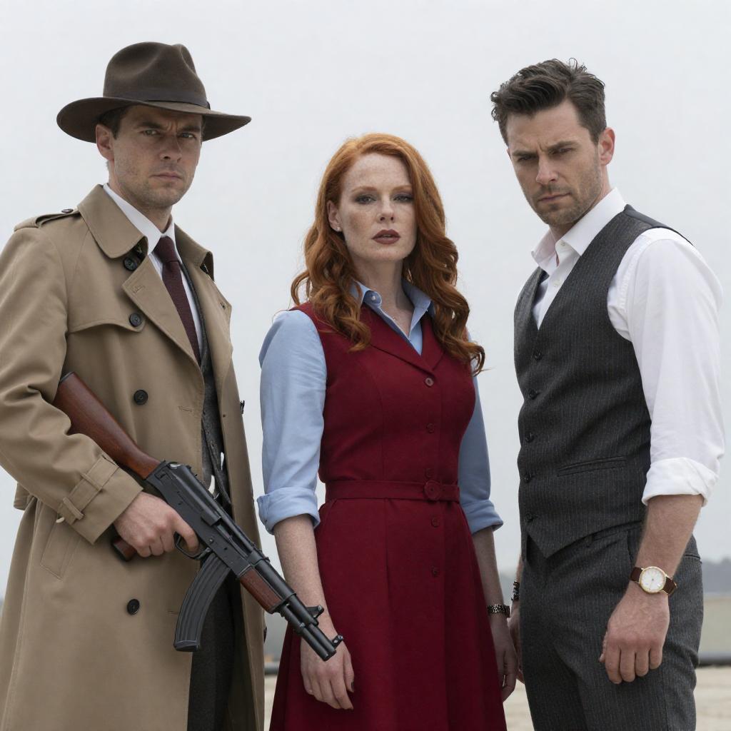 Photograph of three people in a dramatic scene. Red-haired woman in center, wearing red dress and light blue shirt, stands between two men. Left man in brown hat, trench coat, holding Thompson submachine gun, intense expression. Right man with short dark hair, pinstripe vest, white shirt, looking down, serious expression. Overcast sky background, bright light on right.