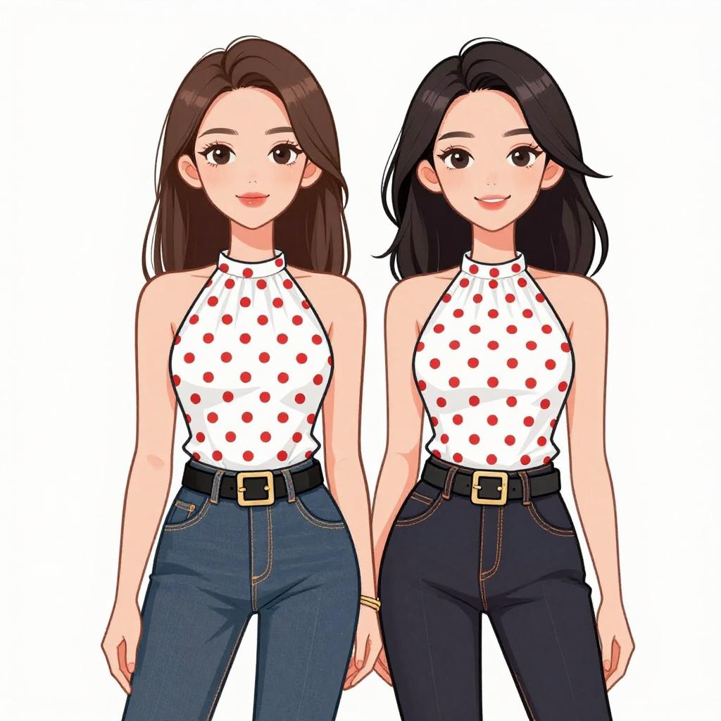 Woman with pretty face and pretty hair. smiling Woman, casual chic, sleeveless white halter top with red polka dots, subtle ruffle detail at hem, fitted high-waist dark denim jeans, wide black belt with large rectangular buckle, thin gold bangle on wrist, plain white background. --sref 1467