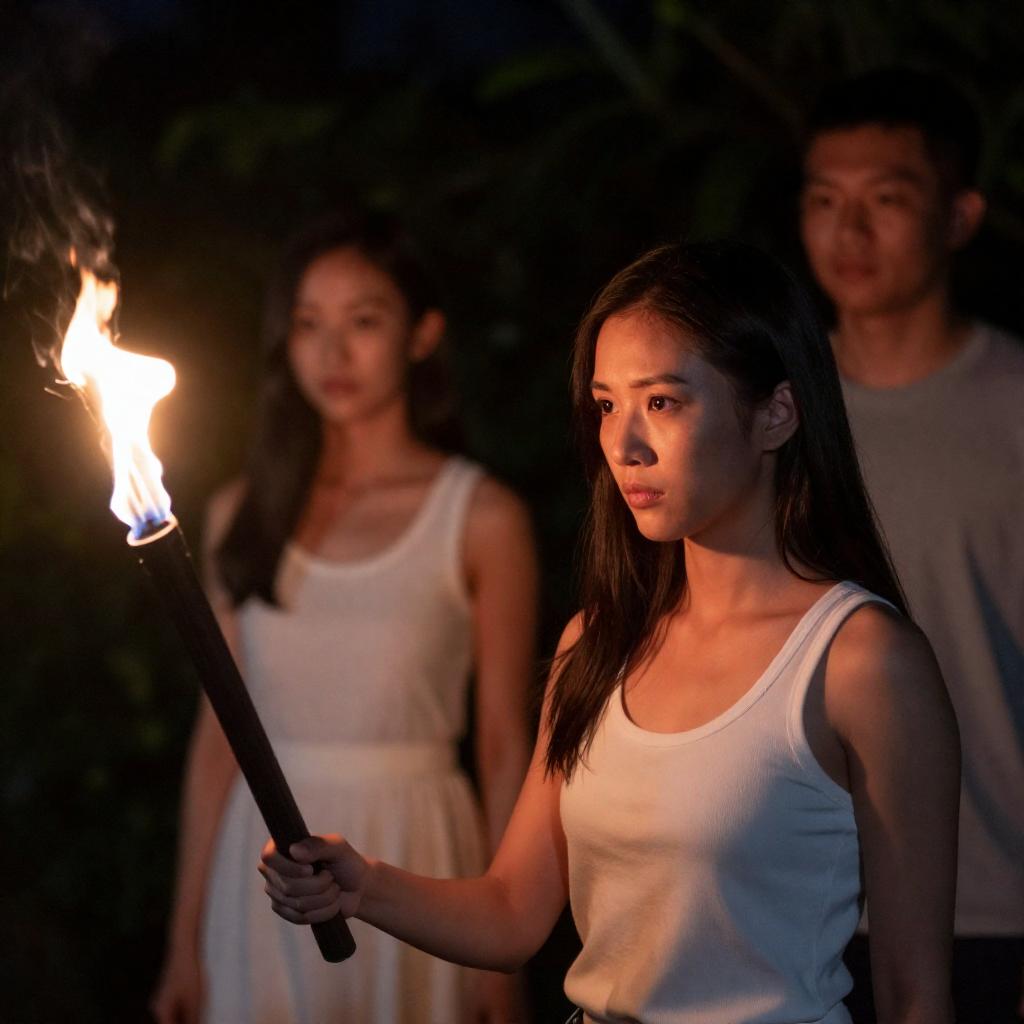 Photograph of three men in a dark room. Foreground man with dark hair, wearing a dark coat, points at another man with dark hair in a suit, who stands facing him. A third man in a suit stands to the right. Bright, flame-like torch above them. Background is shadowy and dimly lit.