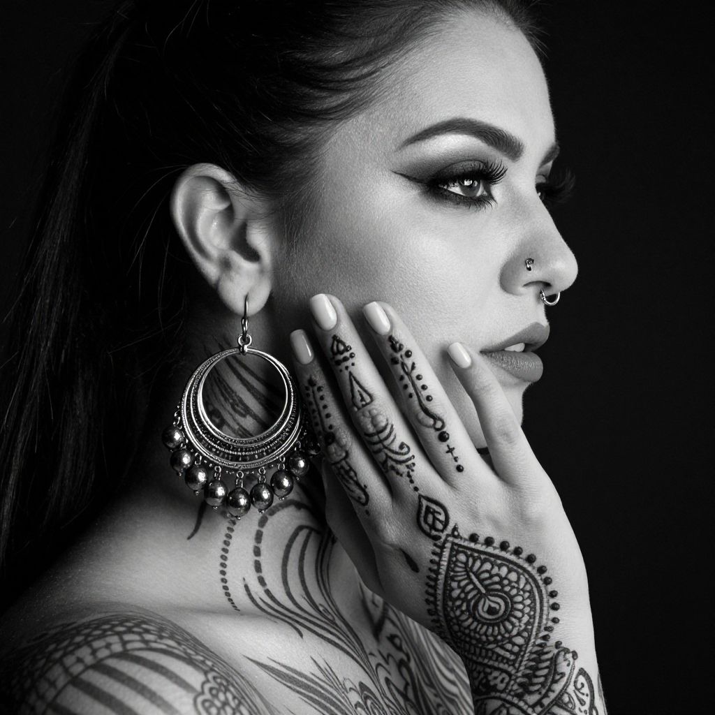 Photograph of a woman with long black hair, raising her arms to reveal an intricate black tattoo on her right arm. She wears a white sleeveless
