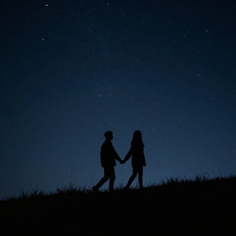 Silhouetted figures gracefully walk hand-in-hand along a grassy ridge under a starlit sky, their forms illuminated by distant celestial lights, evoking a serene nocturnal journey.
