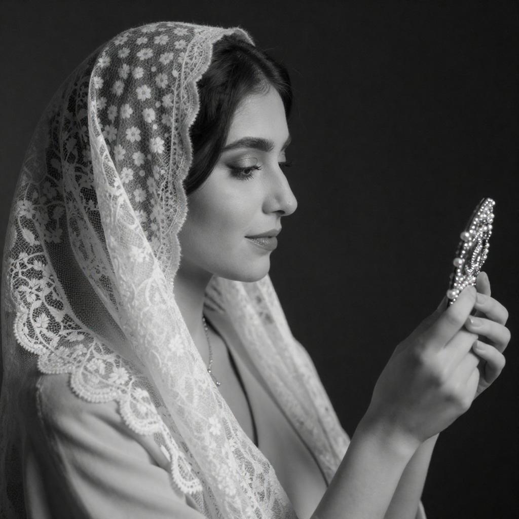 Black and white photograph of a woman in profile, wearing an intricately patterned headscarf with small flowers and a lace veil. She has a delicate necklace and looks at a detailed, beaded object in her right hand. The background is dark. Her face is calm, with soft features and slightly closed eyes.