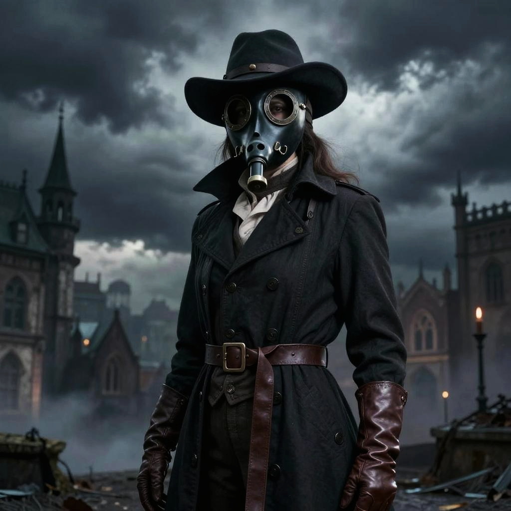 Plague doctor female in a gothic cityscape, wearing vintage beaked mask and hat, leather gloves, with ominous storm clouds overhead, cinematic and moody scene