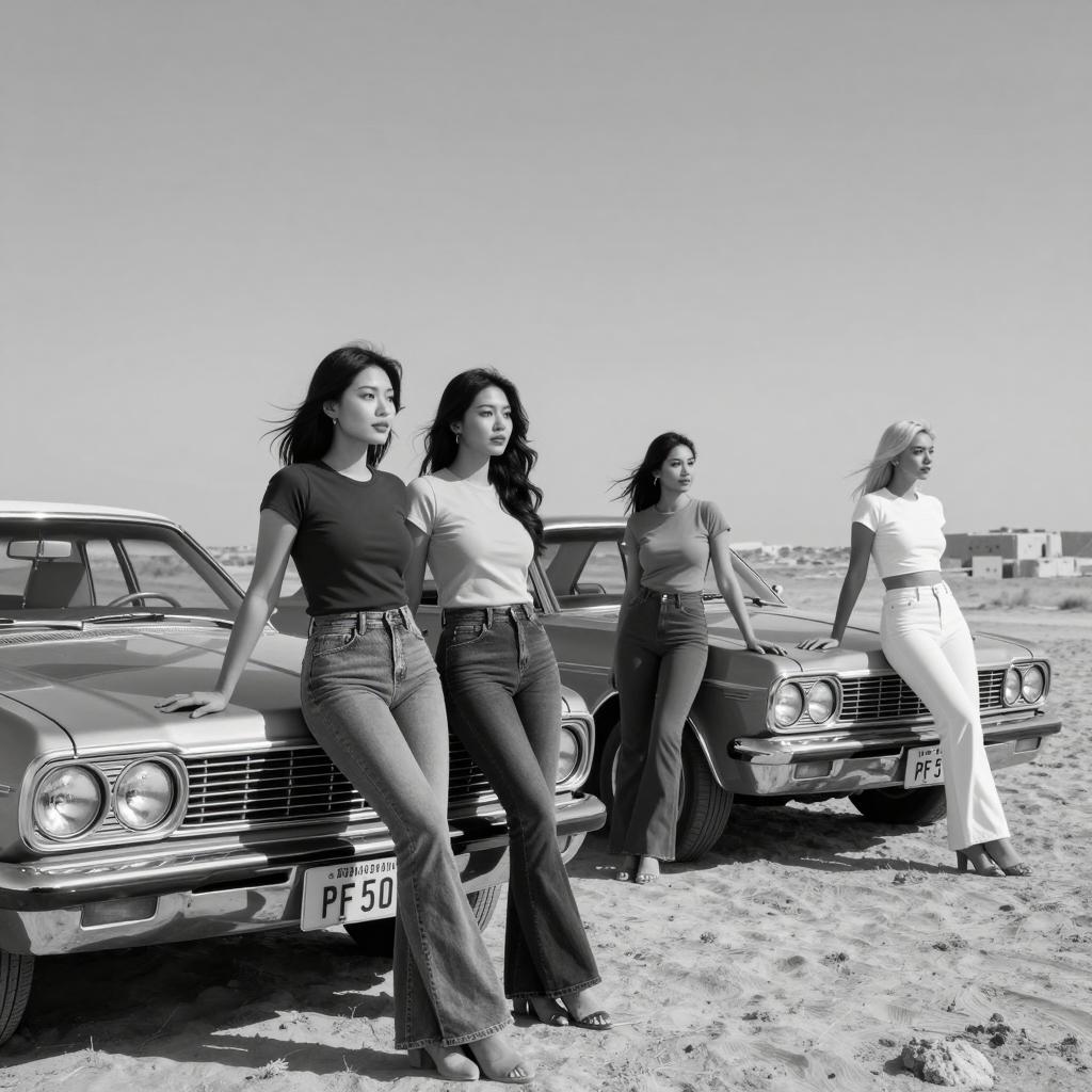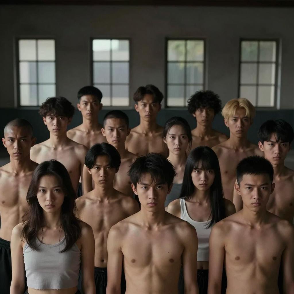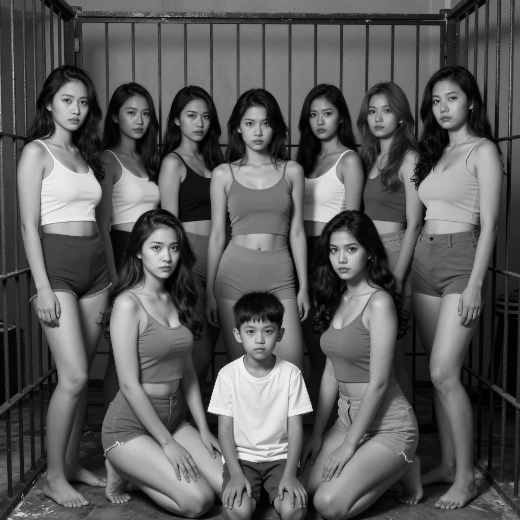 Black and white photograph featuring seven young Asian women and one young Asian boy in a dimly lit, cage-like room. The women wear fitted crop tops and shorts, displaying varied hairstyles and intense facial expressions. The boy, positioned seated in front, wears a white t-shirt and looks directly at the camera with a neutral expression. The background includes metal bars and a textured wall, creating a stark and dramatic atmosphere.