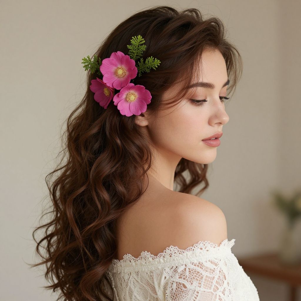 Elegant portrait of a woman adorned with three vibrant pink flowers and green foliage delicately placed in her wavy brown hair, complementing her off-the-shoulder lace top in a softly lit indoor setting.