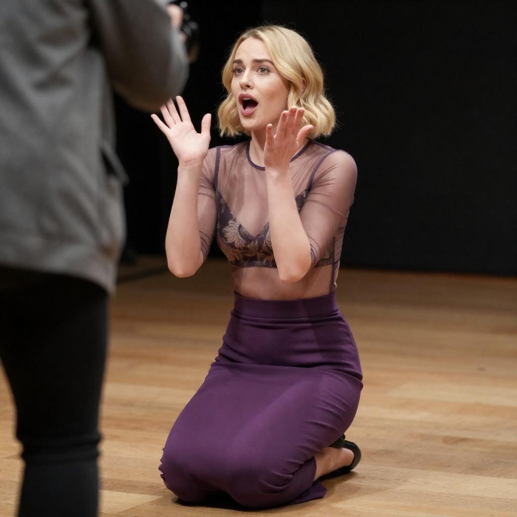 Photograph of a blonde woman with short hair, wearing a sheer, patterned top and a purple skirt, kneeling on a wooden floor. She has an open-mouthed, expressive look, with hands raised near her face. A person in a gray coat is partially visible on the left, holding a camera. The background is dark and indistinct.