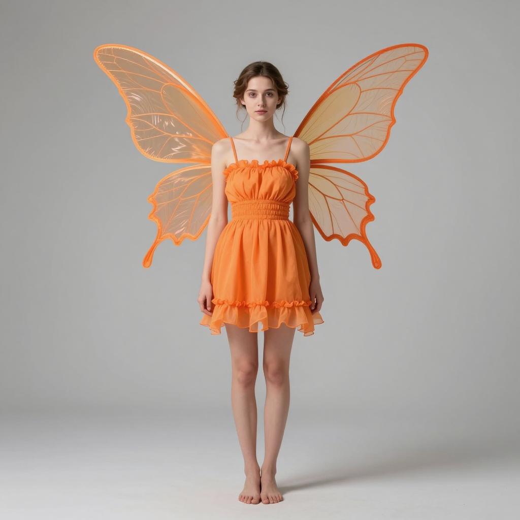 Orange fairy wings costume, photorealistic model, standing, full body, front view, young woman, fairy costume, orange butterfly wings, orange dress, strapless, gathered waist, frilled edges, thin straps, bare legs, brown hair, simple updo, neutral expression, light skin, gray studio background, soft shadows, bright lighting, flat gray floor, feet close together, standing upright, digital photograph, fantasy, whimsical, delicate, slender physique, elegant, fashionable, ethereal, modern fairy tale, vivid colors