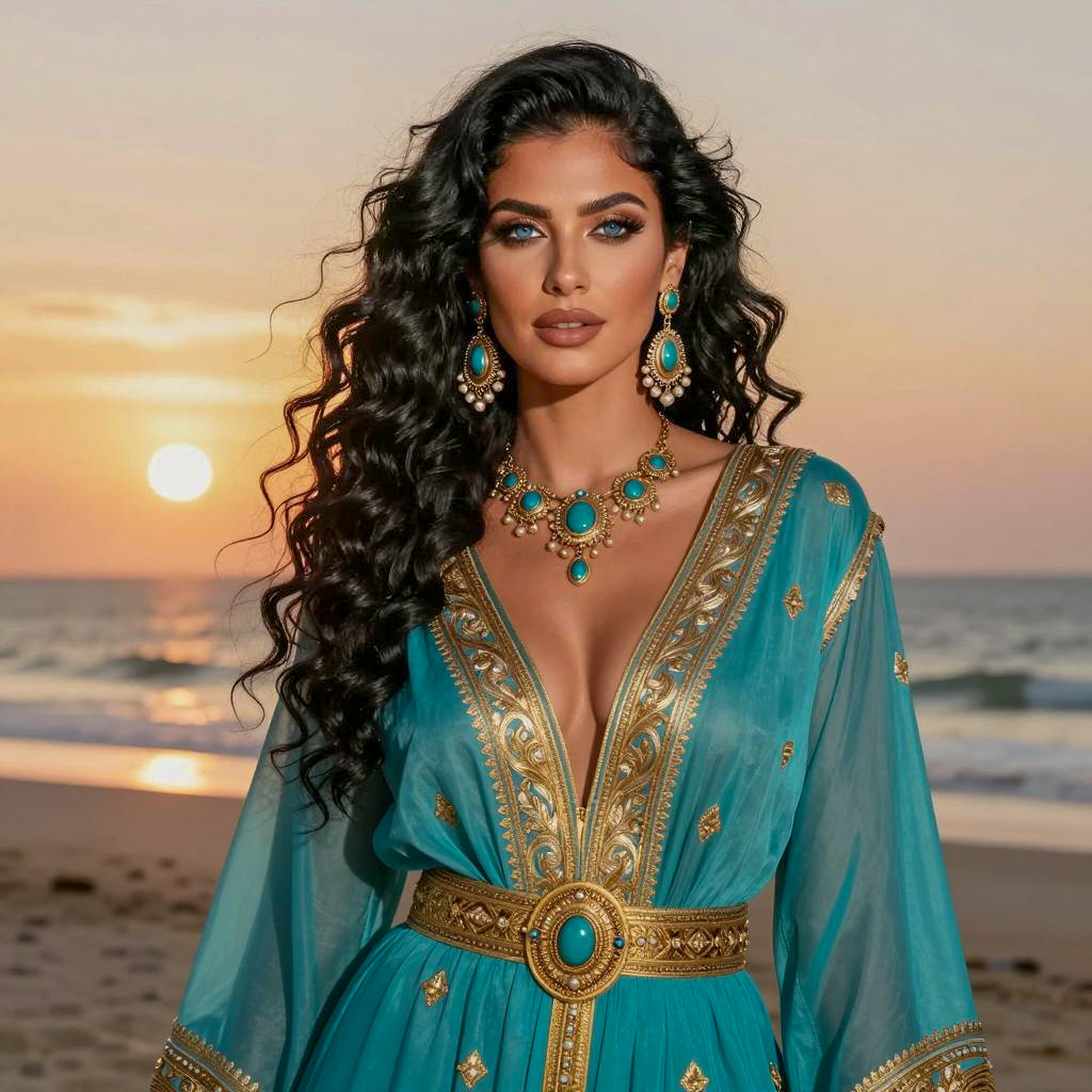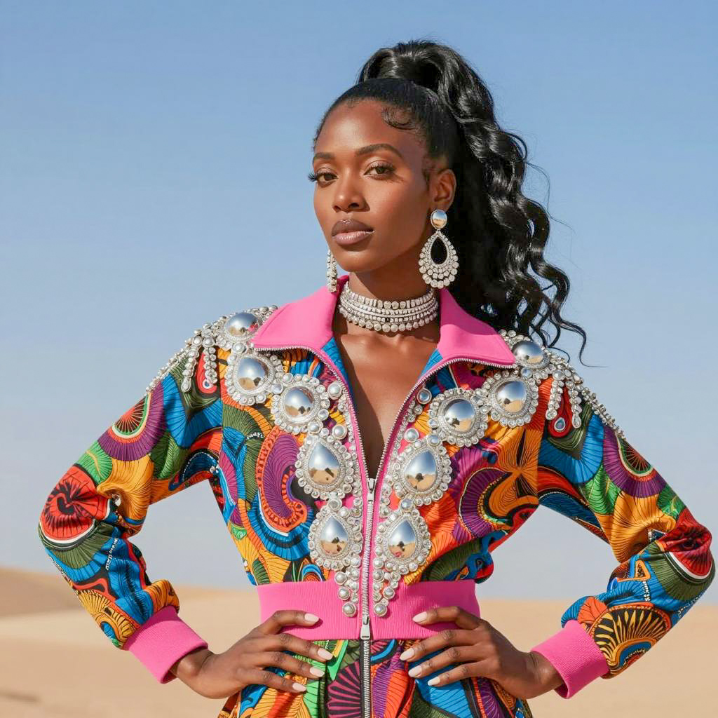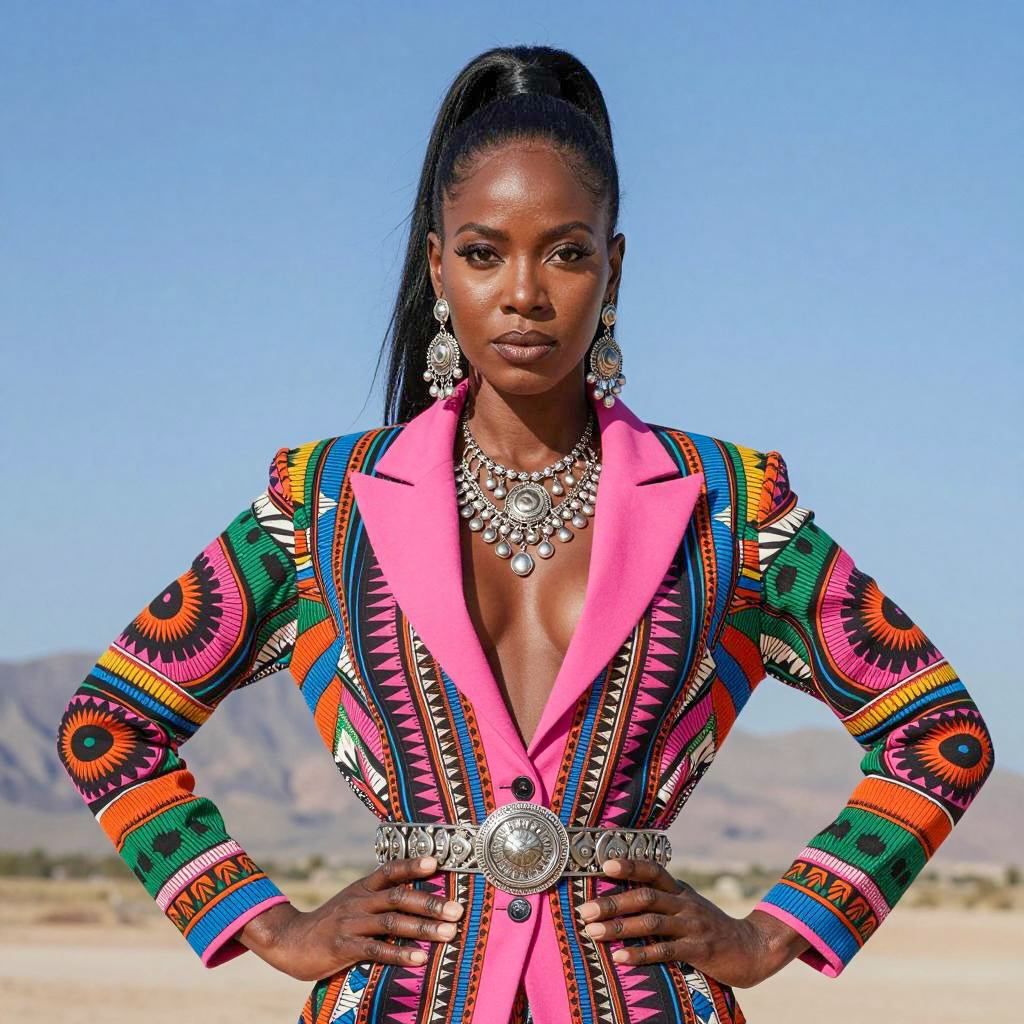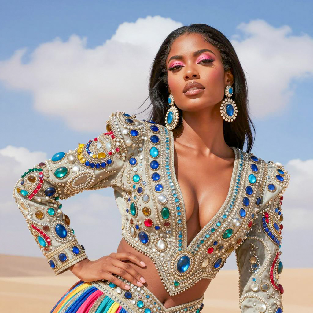 Confident Woman in Ornate Gem-Embellished Outfit in Desert