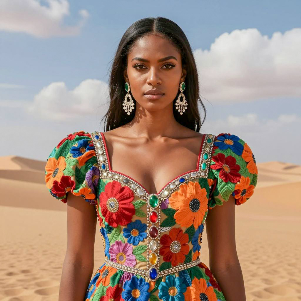 Portrait of a woman with dark skin and straight black hair wearing striking pink eye makeup. She is dressed in an intricately embroidered outfit adorned with silver, blue, red, and multicolored gems, featuring puffy sleeves and a deep V neckline. She accessorizes with large, circular gem earrings matching her attire. The image is set against a bright blue sky with scattered clouds and desert sand dunes in the background. The woman exudes confidence with her right hand on her hip, slightly turned to the left.