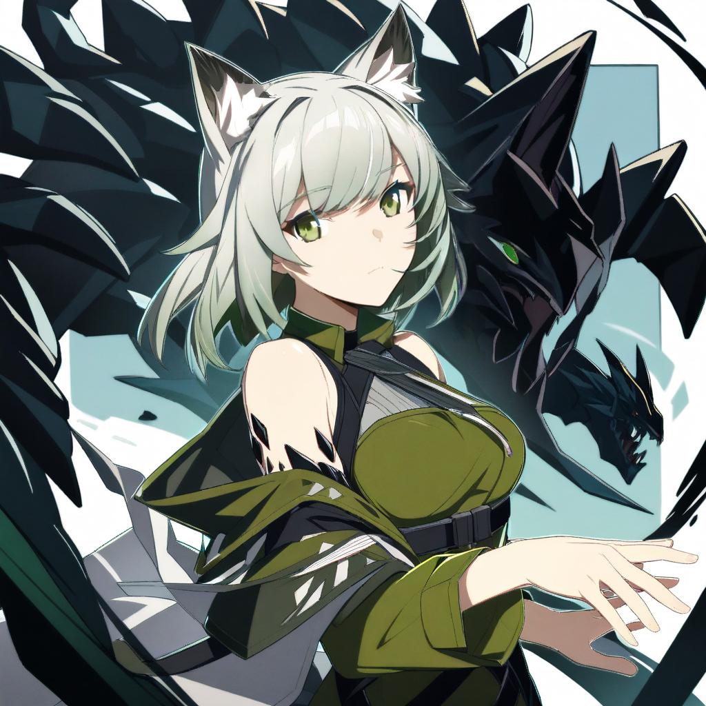 Mon3tr (arknights), arknights, 1girl, cat girl, monster, cat ears, animal ear fluff, green eyes, short hair, green hair, grey hair, white hair, green dress, bare shoulders, long sleeves, oripathy lesion (arknights), by artist nanashino, animagine