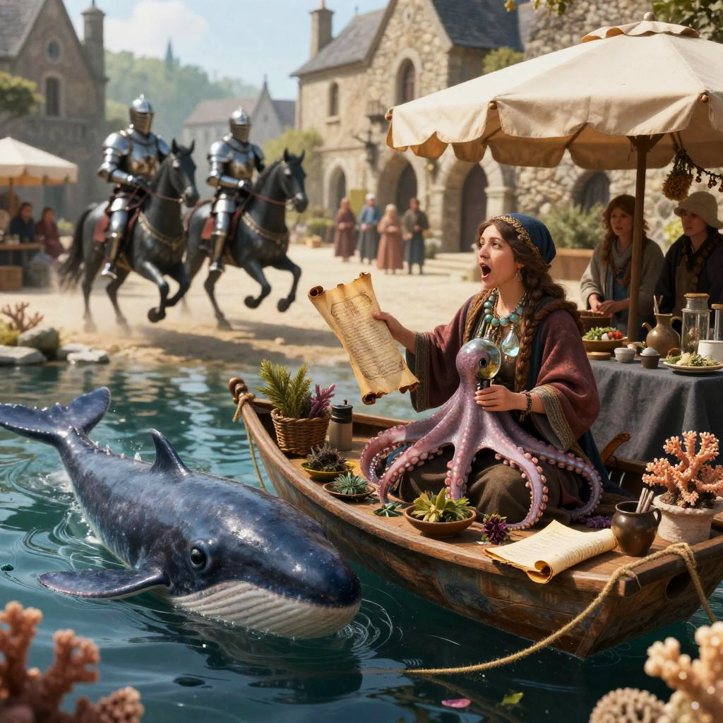 In an enchanted underwater kingdom, a mermaid weaving coral fabrics sings enchanting melodies, the water shimmering with magic around her. In a medieval village square, two knights prepare for a legendary joust, the townsfolk peering anxiously from behind stone walls, the atmosphere thick with tension.:1.2) artgerm, 4k image, sharp focus