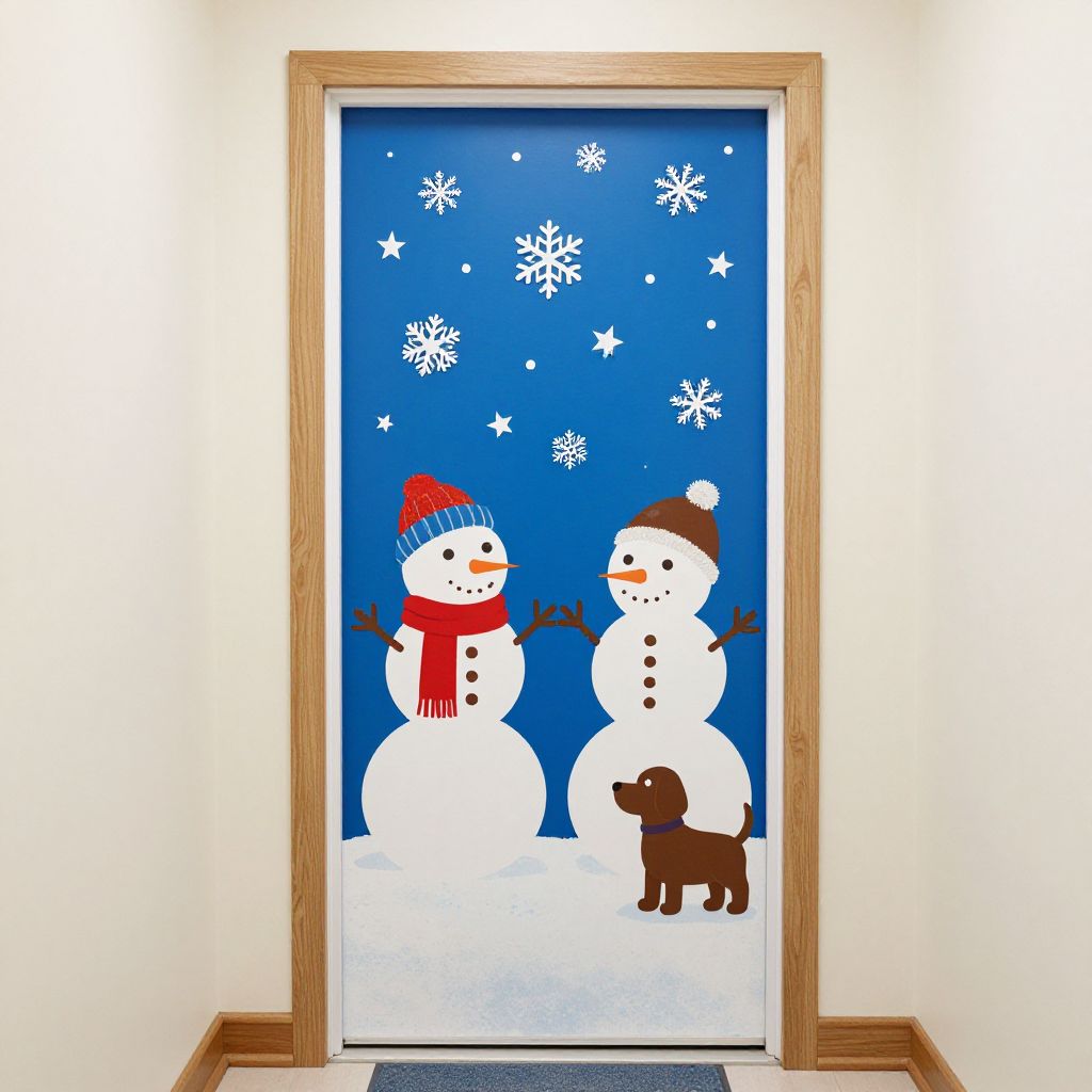 Winter-themed preschool door decorated with a vibrant blue sky featuring snowflakes and stars, a cheerful snowman wearing a red scarf and hat, a brown dog silhouette, and a snowy base, invitingly welcoming visitors into a festive hallway.