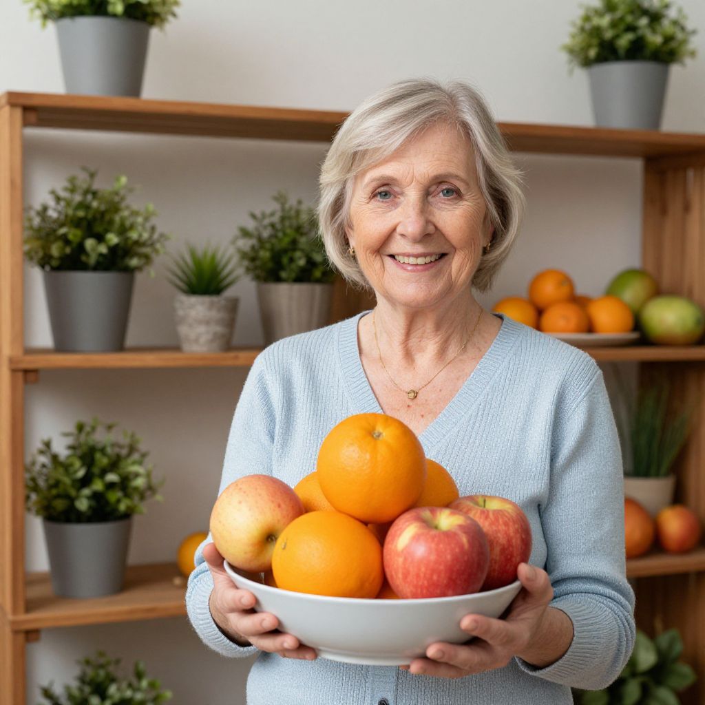 Smiling senior woman holding a bowl of vibrant oranges and apples, surrounded by wooden shelves adorned with potted plants and additional fruits in the background.