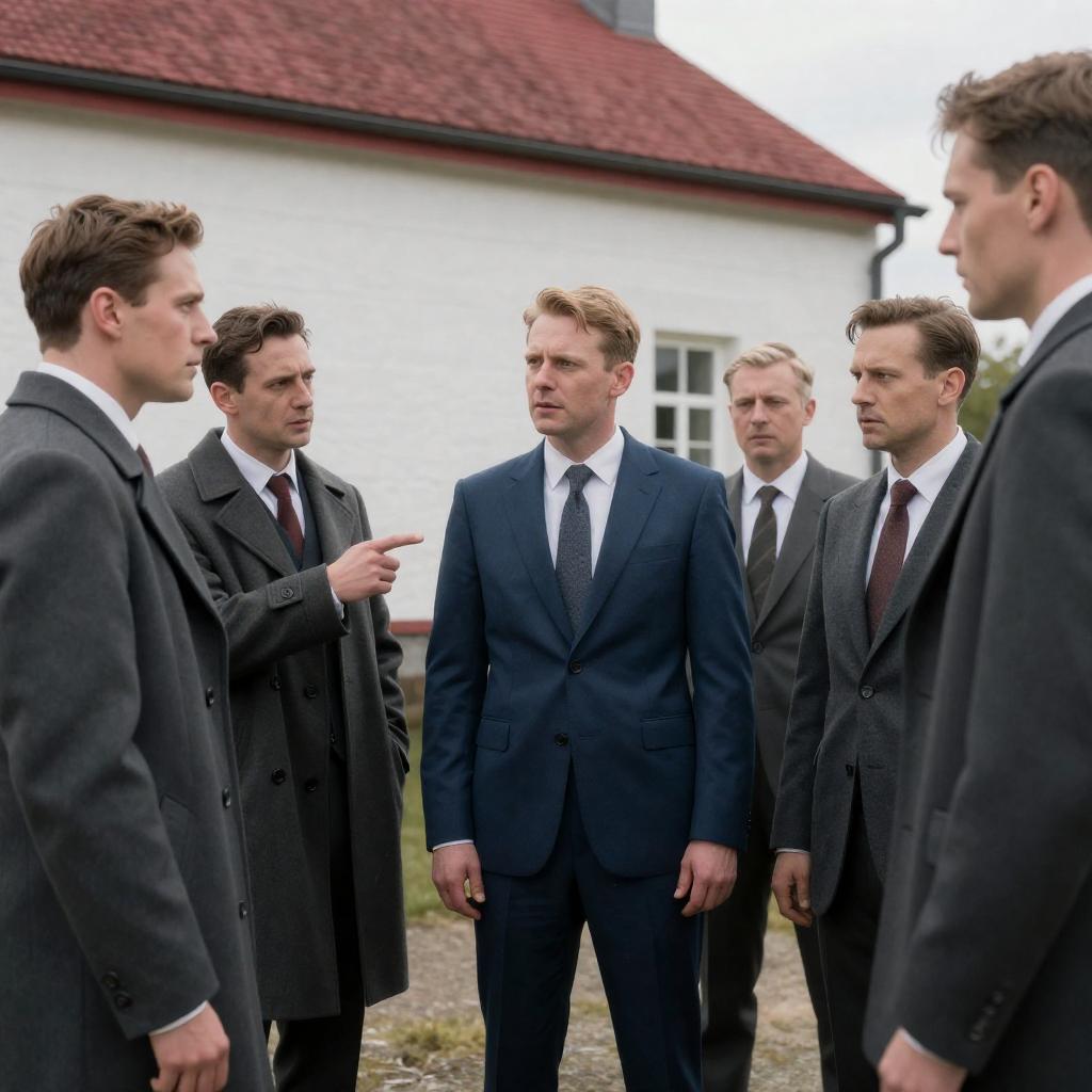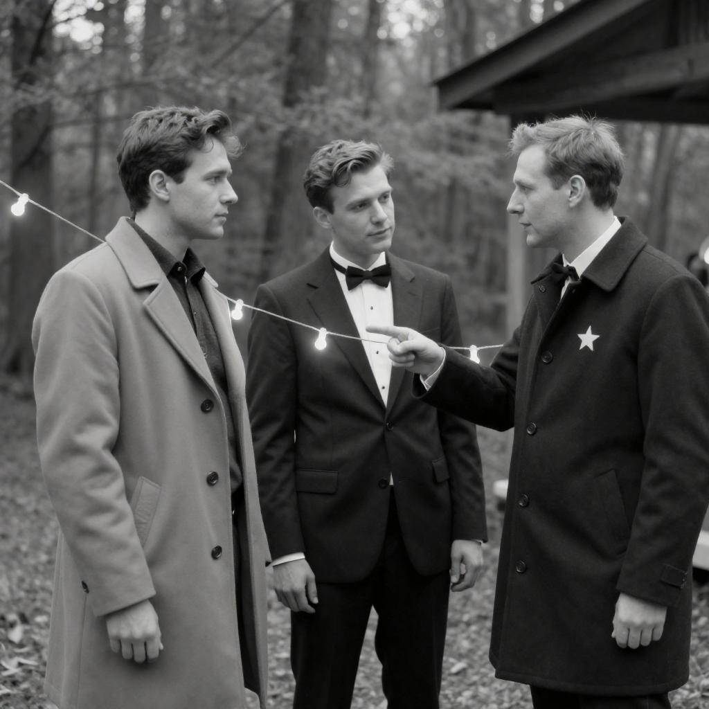 Black-and-white photograph of three men in a forest. The man on the left wears a light-colored coat, the middle man in a dark suit with a bow tie, and the right man in a dark coat with a star-shaped badge. The right man points at the middle man, who holds a string of lights. Trees and a wooden structure are in the background.