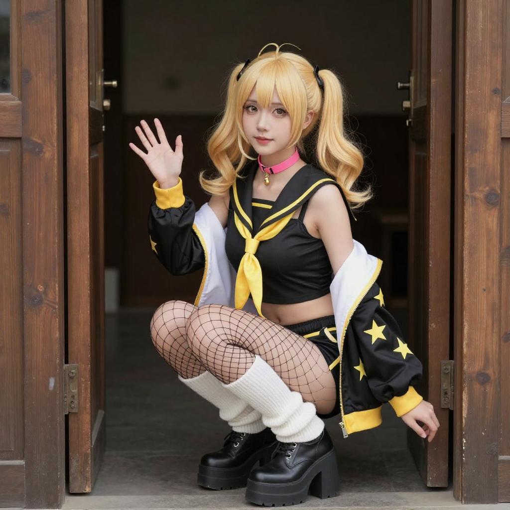 Photograph of a blonde cosplayer with long hair, wearing a black leather crop top, black shorts, white leg warmers, and black boots. She kneels on a stone floor, leaning against a wooden door with one hand, looking over her shoulder with a seductive expression. Warm light illuminates her pale skin and the rustic background.