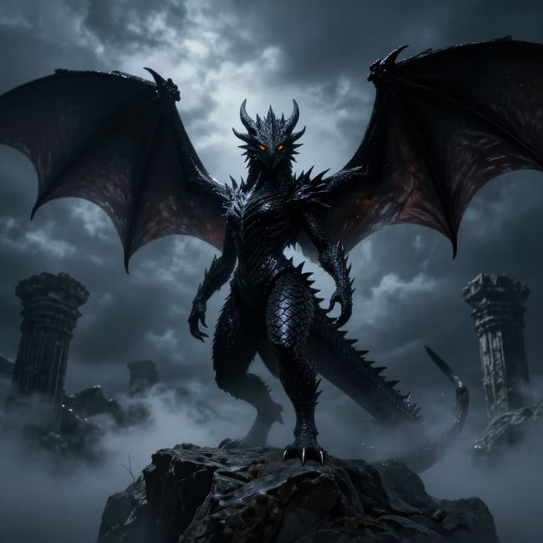 Digital artwork of a massive, menacing black dragon standing on a rocky outcrop. The dragon's wings are spread wide, with intricate, jagged scales and sharp, menacing horns. Its eyes glow with an eerie light, and its tail curls around its legs. The background features a cloudy, moonlit sky and crumbling stone columns, shrouded in mist. The overall color palette is dominated by dark blues and blacks, creating a foreboding, otherworldly atmosphere. The dragon's powerful stance and detailed textures give it a lifelike, fearsome presence.
