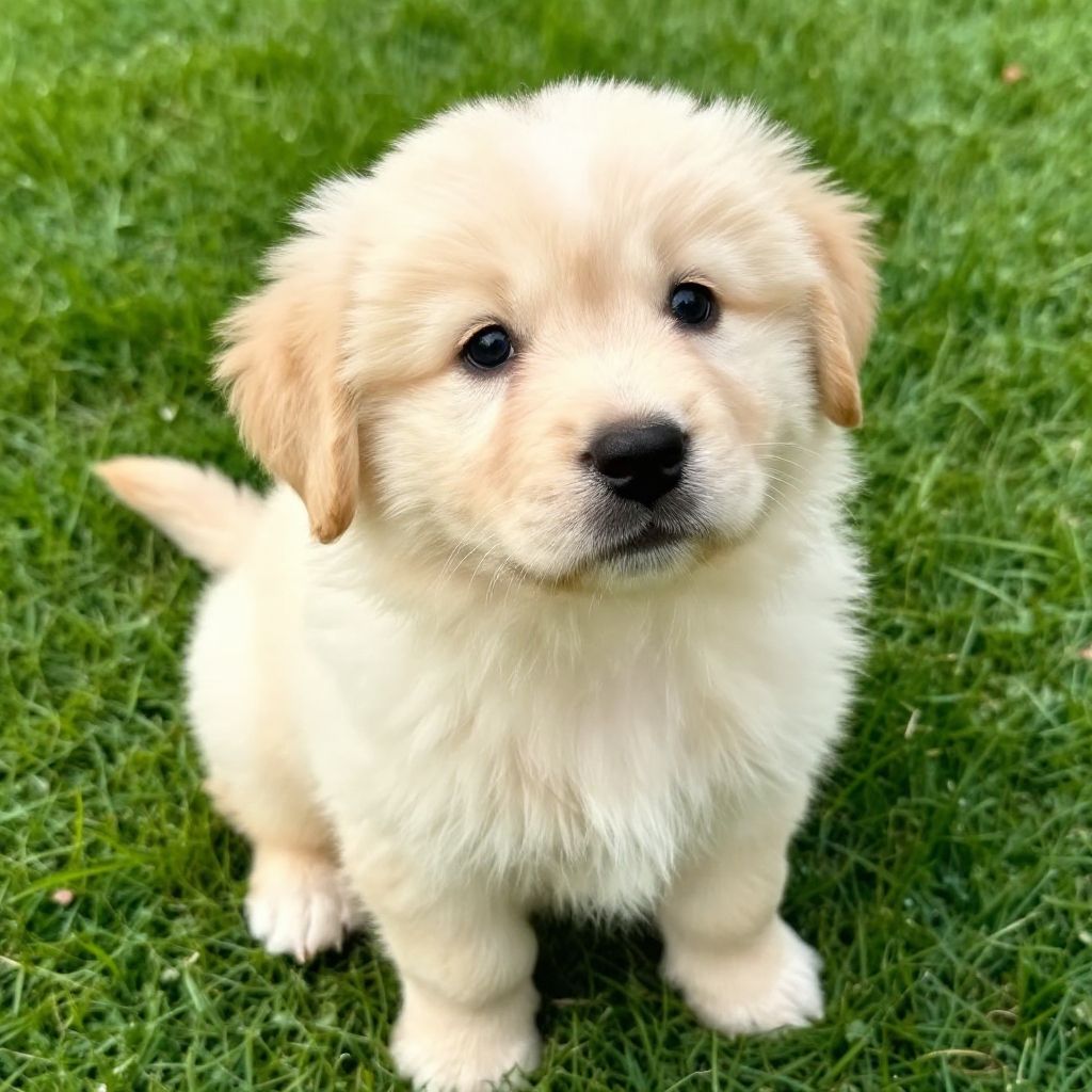 Photograph of an adorable, fluffy, cream-colored Golden Retriever puppy with black eyes, sitting on vibrant green grass, looking up.