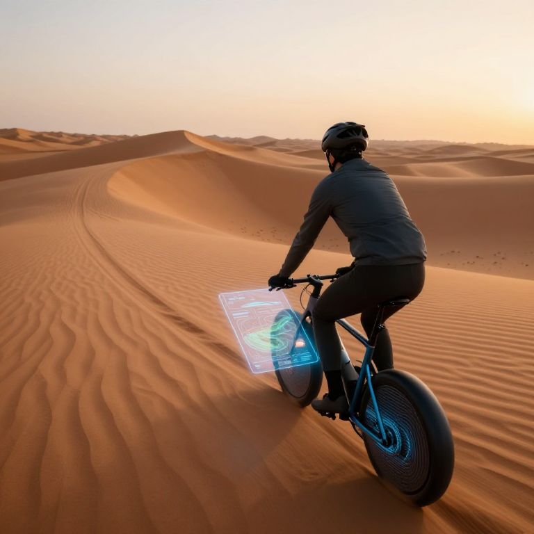 Bike riding AI prompt: A desert dune road at dawn, a rider on a solar-powered bike with AI-generated terrain mapping, navigating shifting sand patterns with smart GPS and predictive wind data visualized through floating digital panels on the handlebars.