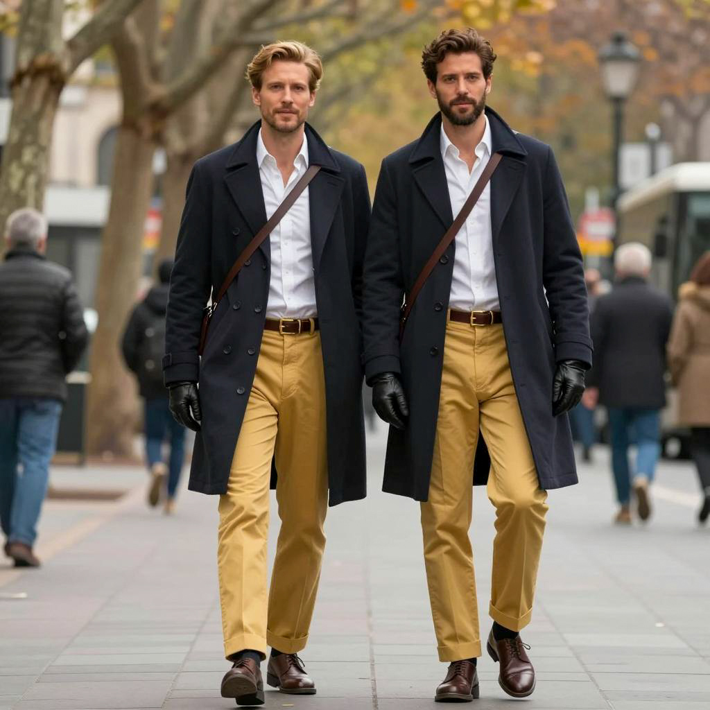 Iconic duos costume male, photorealistic, man standing on city street, daytime, tall and handsome, brown hair and beard, wearing long dark coat, yellow pants, white shirt, black gloves, brown leather belt with gold buckle, brown shoes, brown crossbody strap, leafy trees in background, blurred city background, people walking in distance, urban setting, autumn colors, casual yet stylish outfit, confident expression, natural light, warm and inviting atmosphere