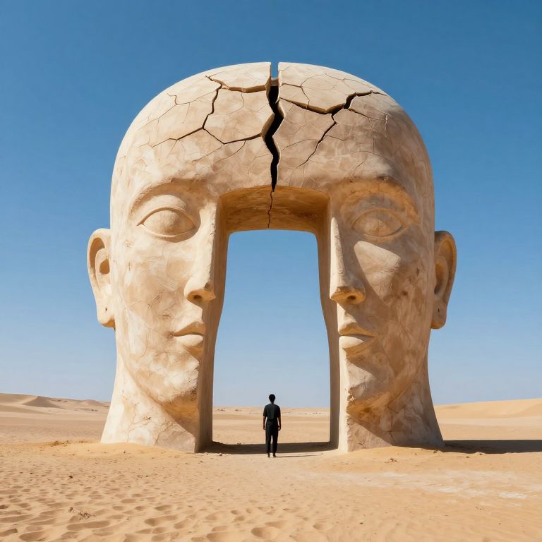 A surreal scene of a person standing in a vast desert, framed by a large, cracked head-shaped structure with a portal leading to a clear blue sky.